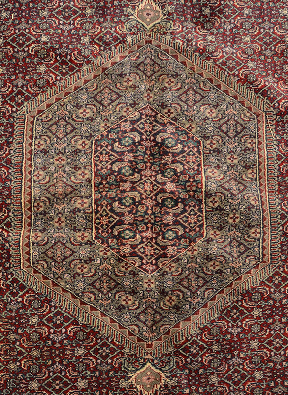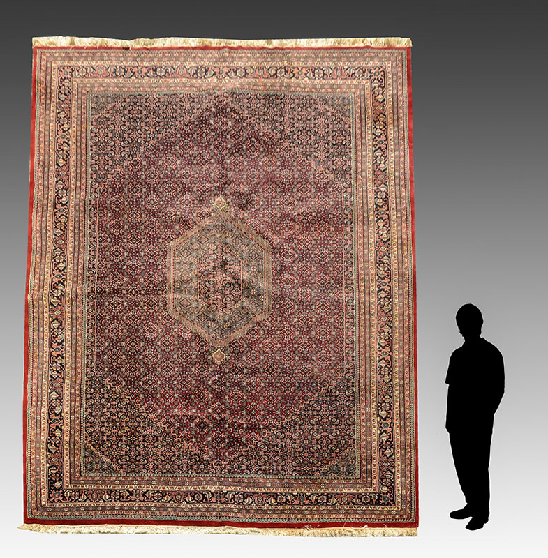 APPROX 15-30 YR OLD PERSIAN HAND KNOTTED WOOL RUG, 9'10'' X 13'10'': This large room size rug has a traditional pattern with some more modern colors used alongside traditional ones. The central medallion has a deep red inner field surrounded by a wide grey band. There are small spandrels at each end that also rest on the deep red field. A variant of the Herati pattern covers the field with a repeating small design of alternating diamonds and squares. The white, grey, turquoise, and black colored motifs really stand out on the deep red field.
