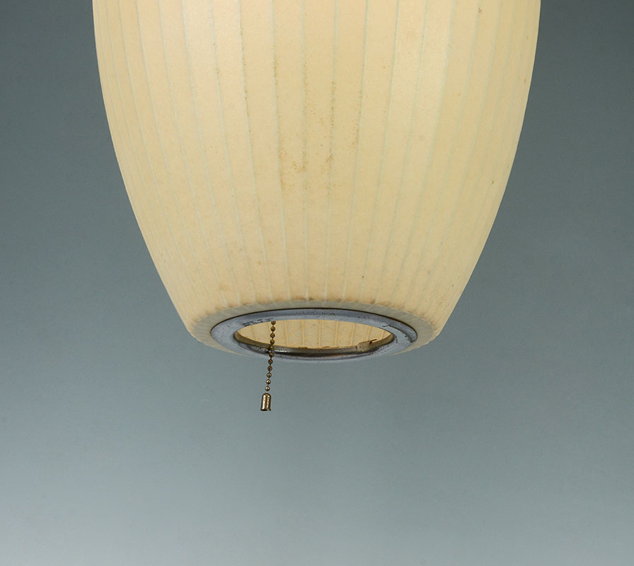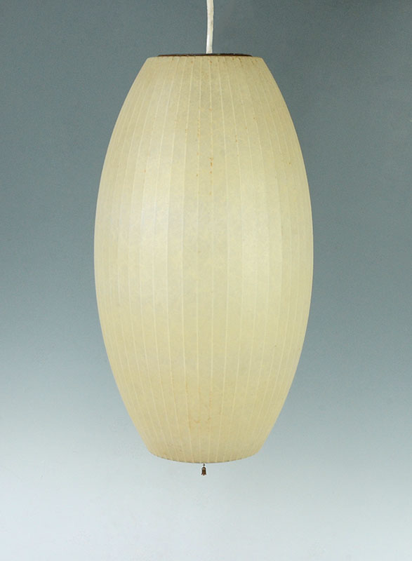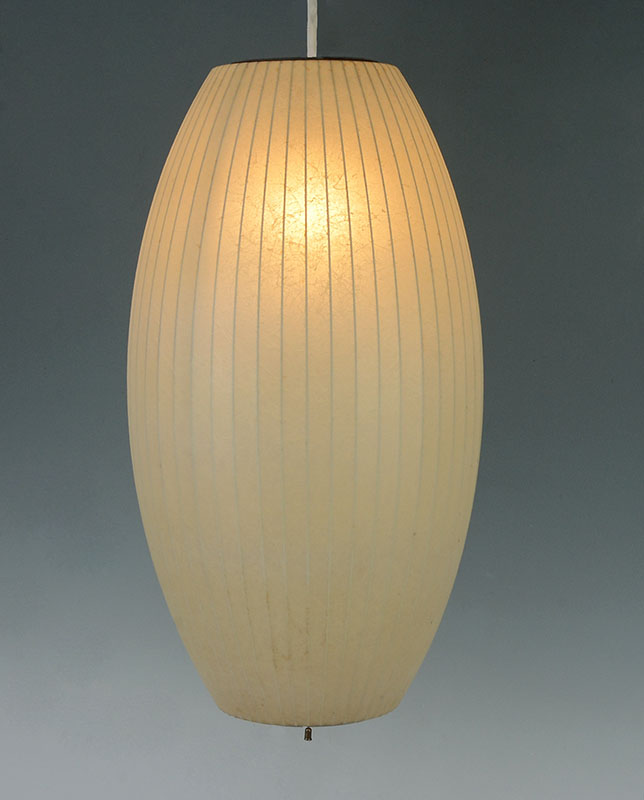 GEORGE NELSON MODERNICA CIGAR BUBBLE LAMP: Latex over metal ribs, chrome heat cap and lower ring. Measures 21 1/2'' h. x 11 1/2''.