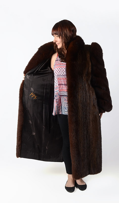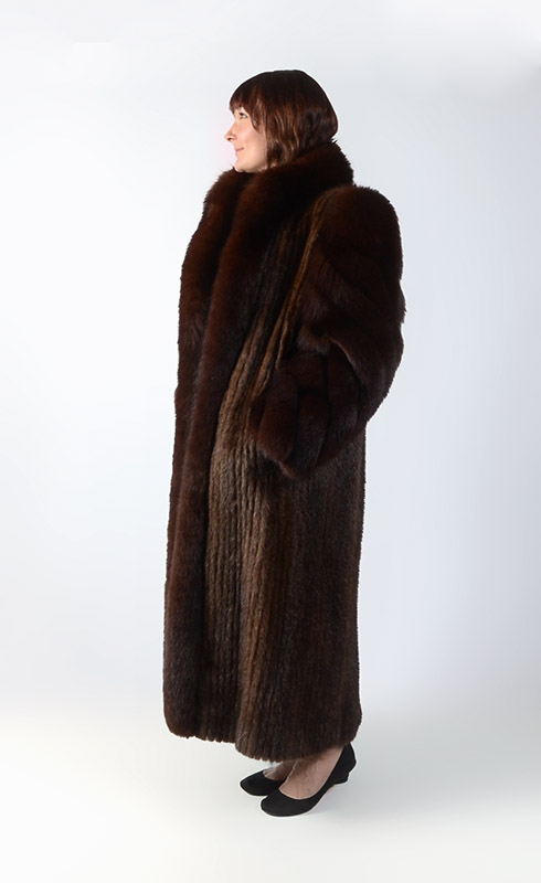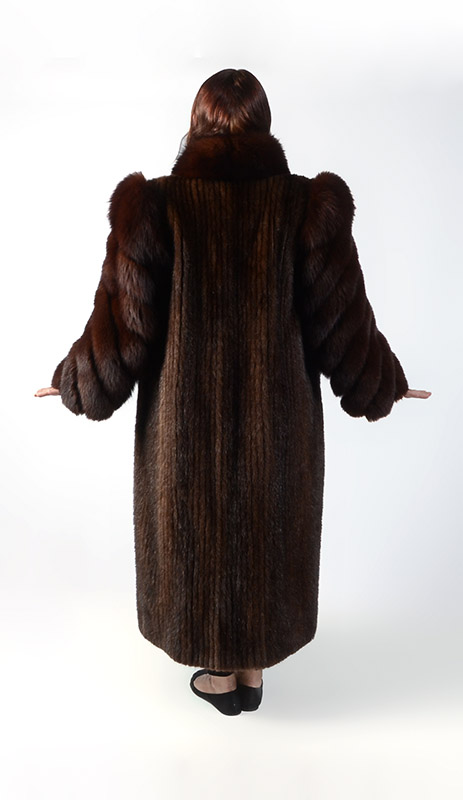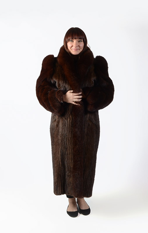 FULL LENGTH MINK COAT: Lovely mink coat trimmed with fox collar and sleeves. Approximate measurements: 27.5'' from neck to sleeve cuff/hem, 15.5'' across back and 47'' length from neck to hem. Approximate size 12.