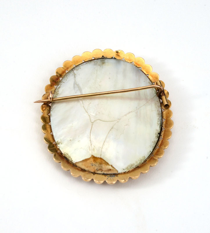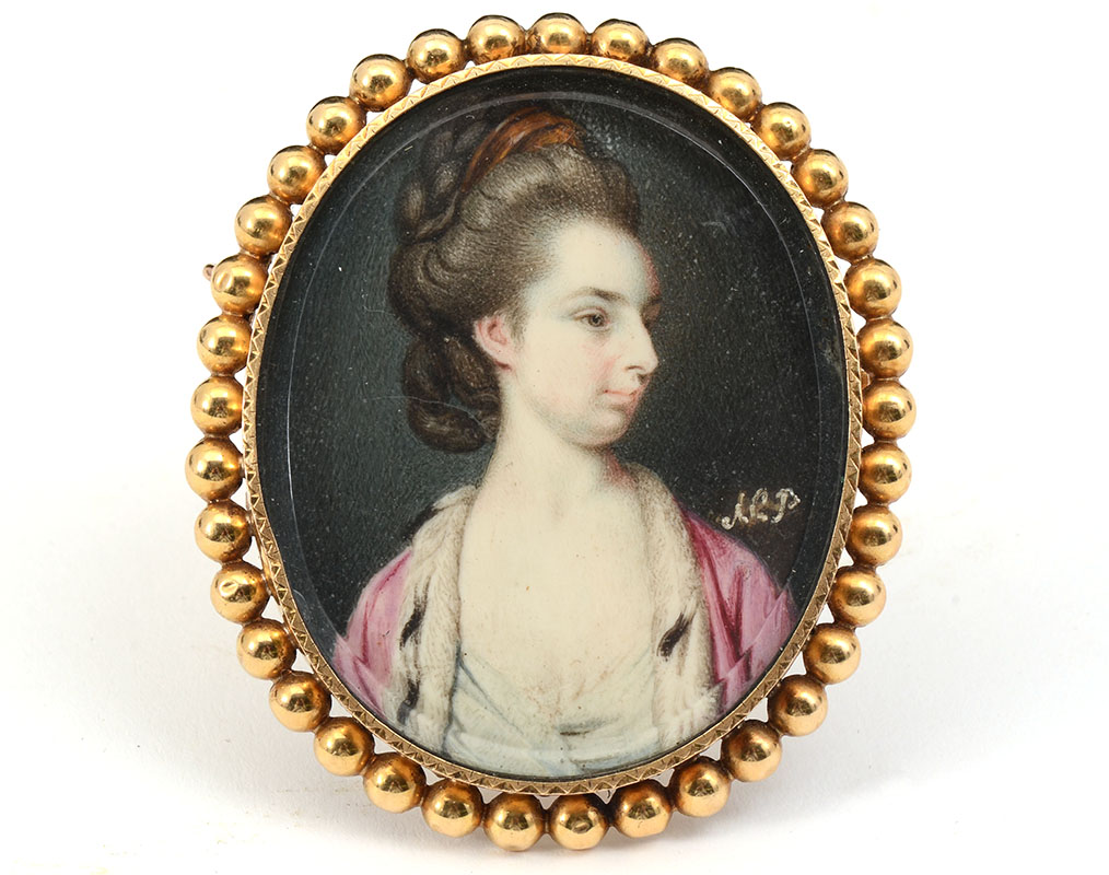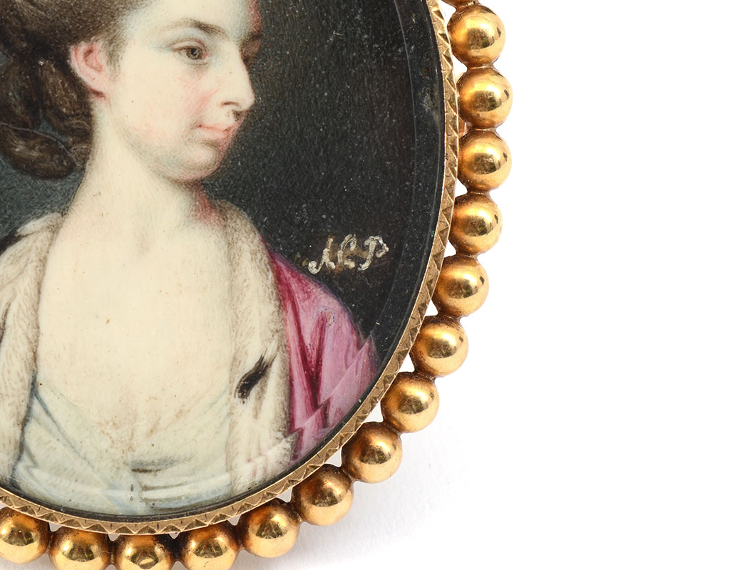 ANNA PEALE? MINIATURE PORTRAIT PAINTING: 2'' x 1.5'', monogramed lower right, 18k gold frame, 2.5'' x 2''.