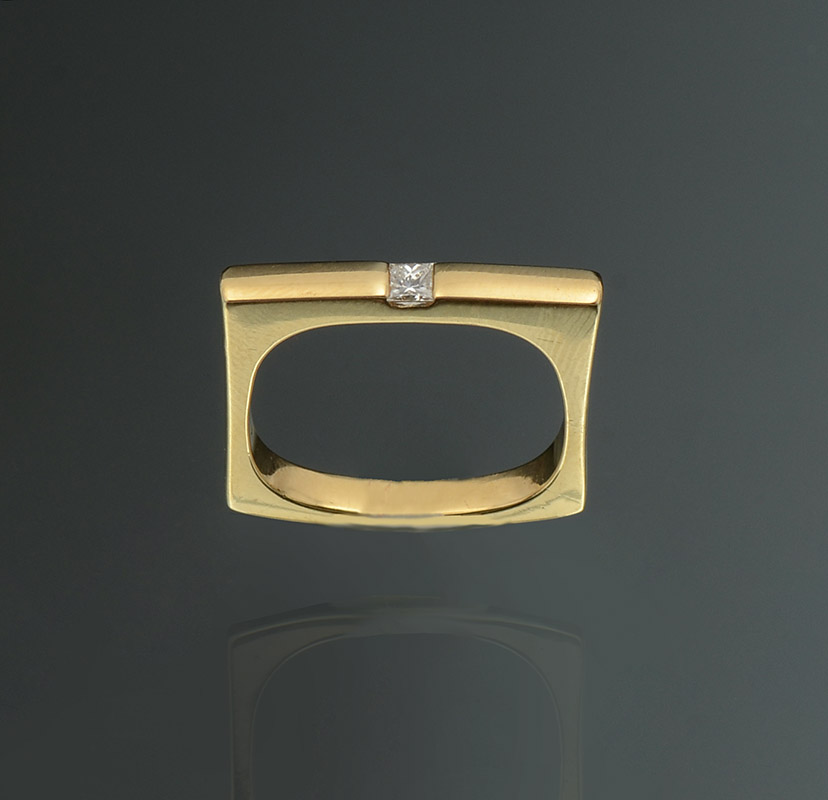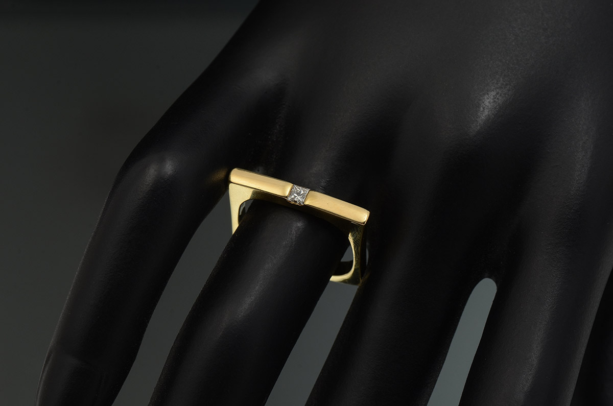 18K DESIGNER PRINCESS CUT DIAMOND RING: Square Princess cut diamond set into contemporary yellow gold ring. Diamond is VS in clarity and G in color. Size 6.5. Total weight 6.6 grams.