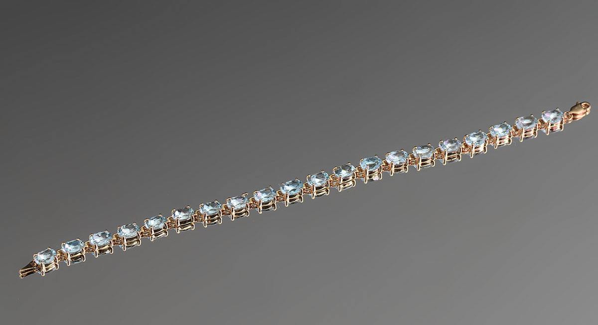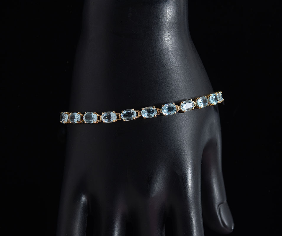 14K 20.00 CTW BLUE TOPAZ BRACELET: 14K yellow gold bracelet contains 20 oval faceted blue topaz. Weight: 20.00 Ct. Approx. ''Sky'' blue in color. The topaz is prong set. Lobster claw clasp. Gold Weight: 6.4 grams. Length: 7.5''