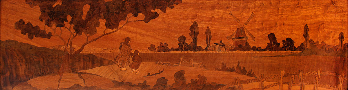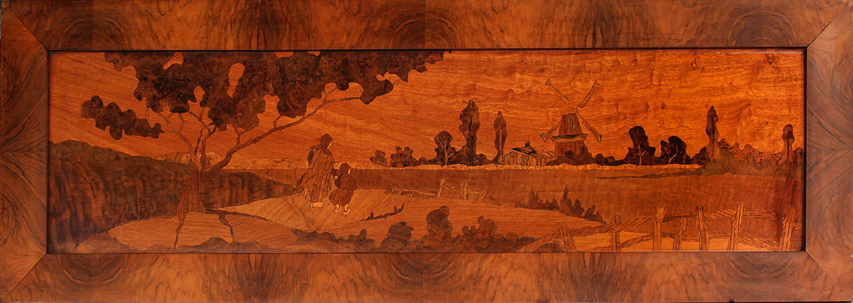 LARGE MARQUETRY INLAID DUTCH LANDSCAPE: Scene Depicts Mother and Daughter Looking into Distance upon Window, unsigned, overall measurements with frame, 18'' x 53.5'', no visible signature.