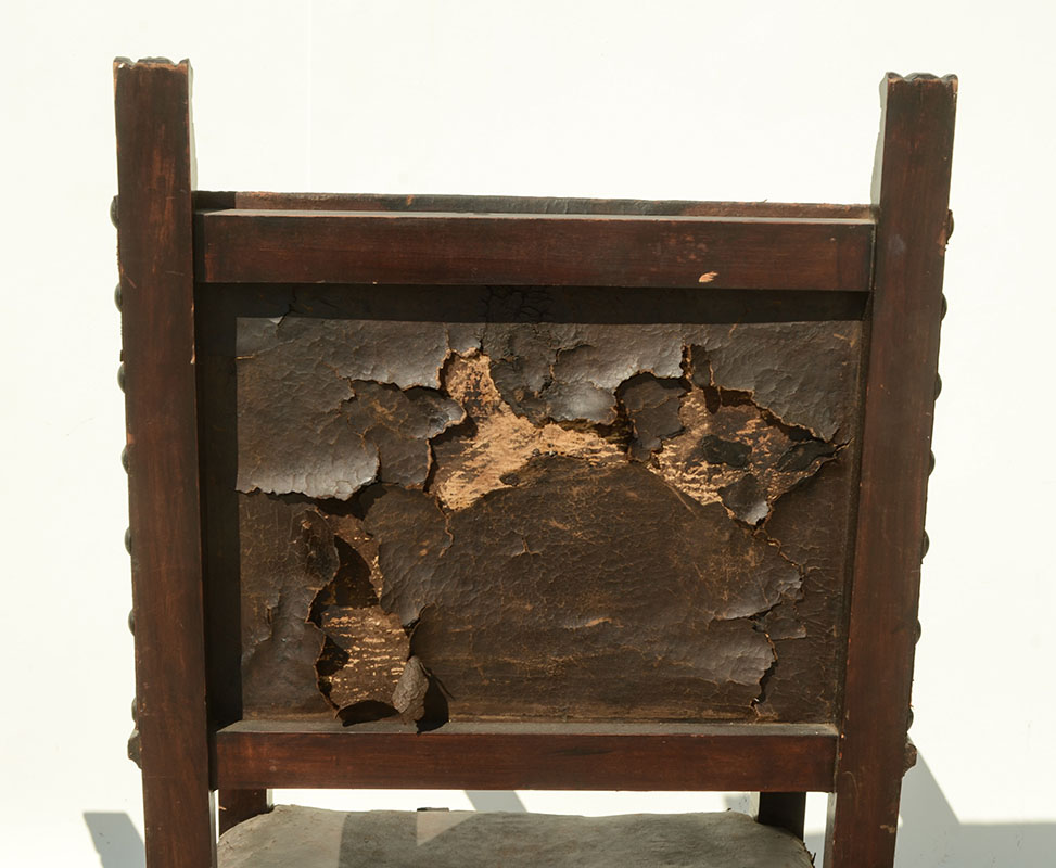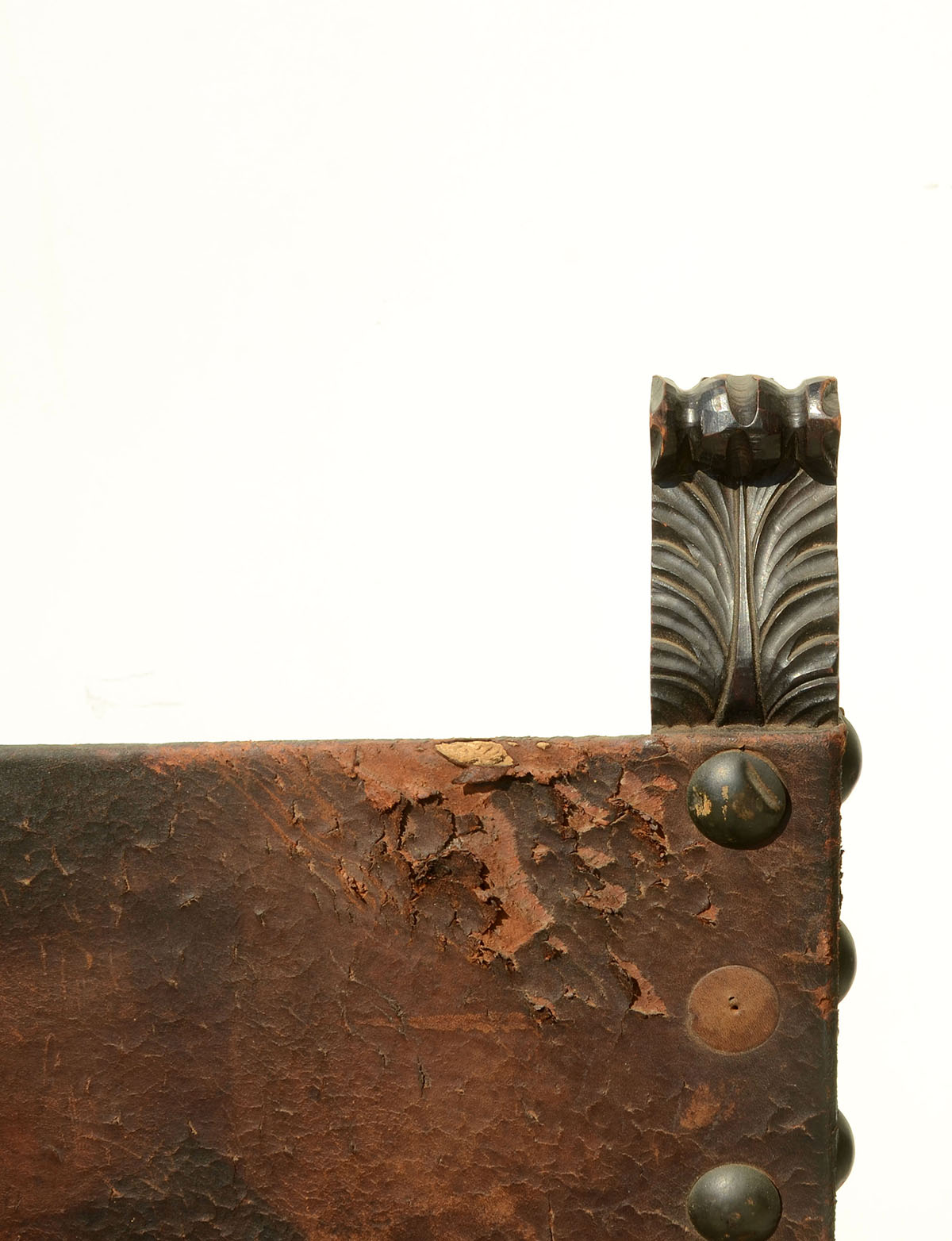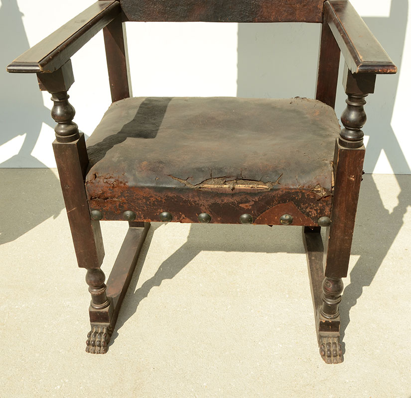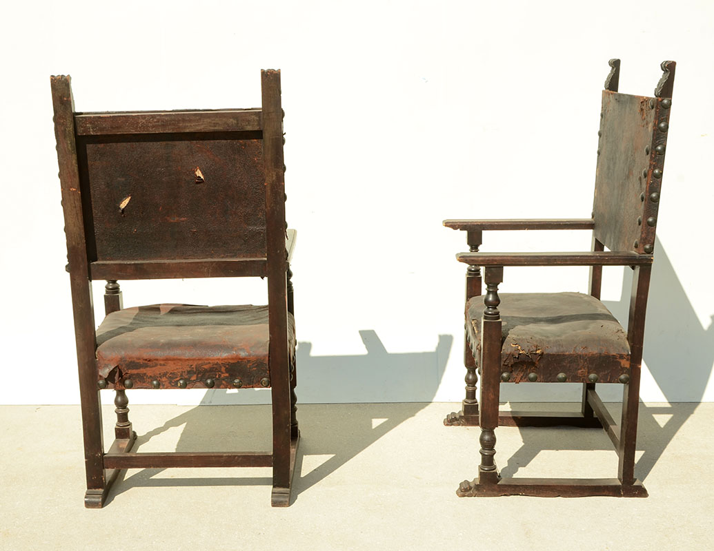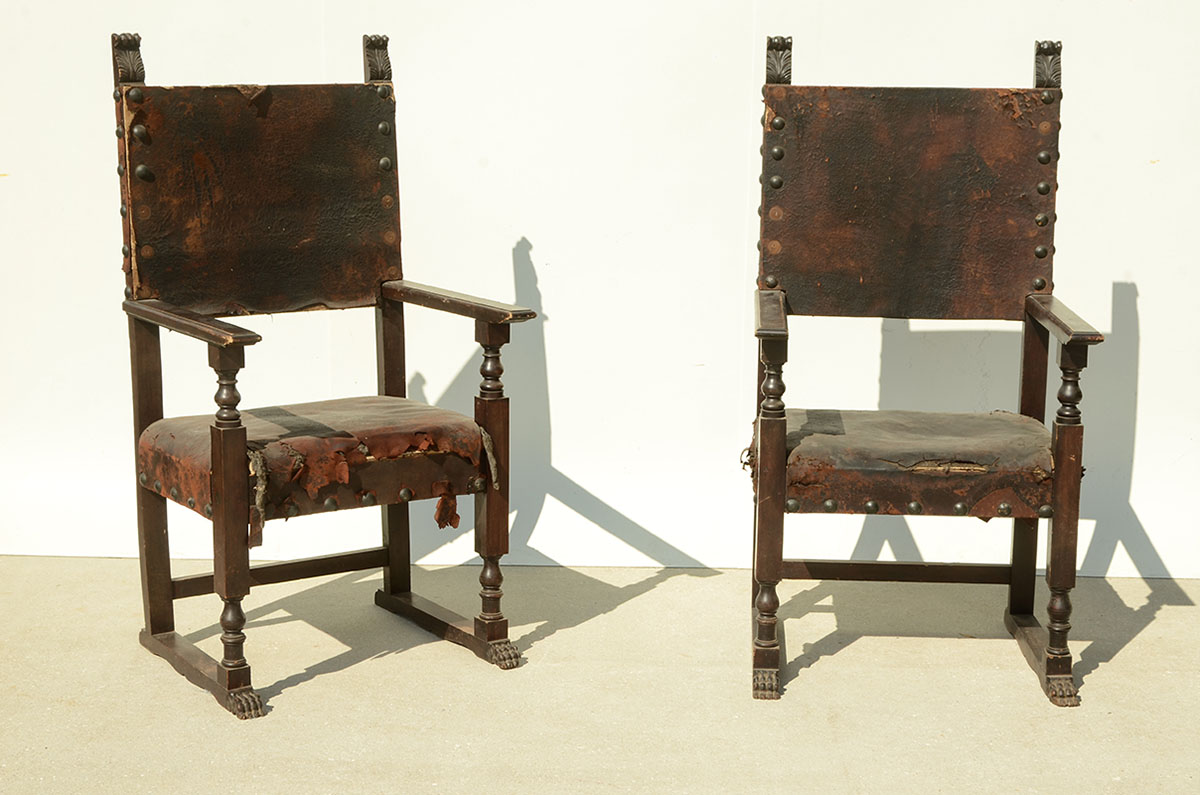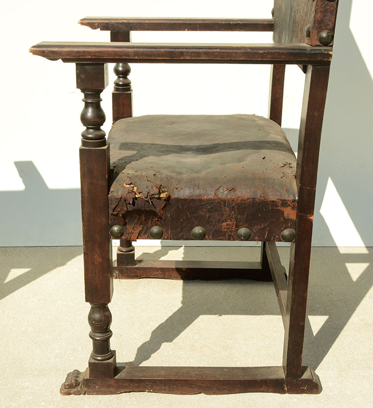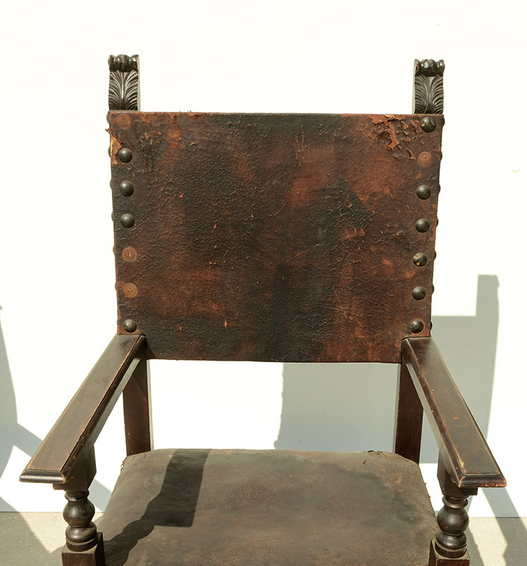 PAIR ITALIAN RENAISSANCE REVIVAL ARM CHAIRS: Throne size chairs, carved acanthus leaf finials. Carved arms, front supports with turned section, carved front paw feet. Tacked leather backs & seats, overall 53 1/2'' h. x 27 1/2'' x 23''.
