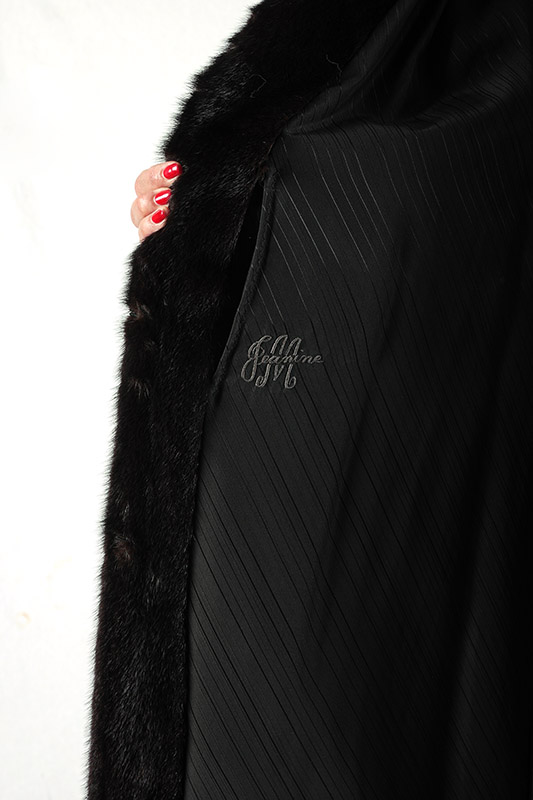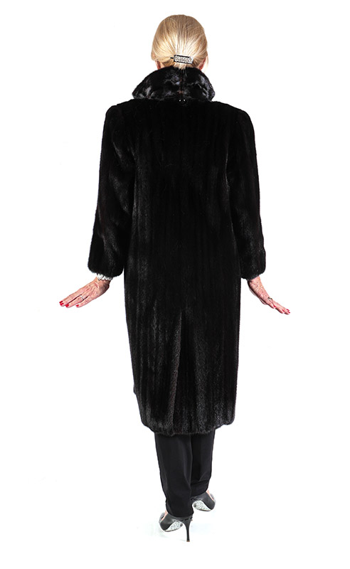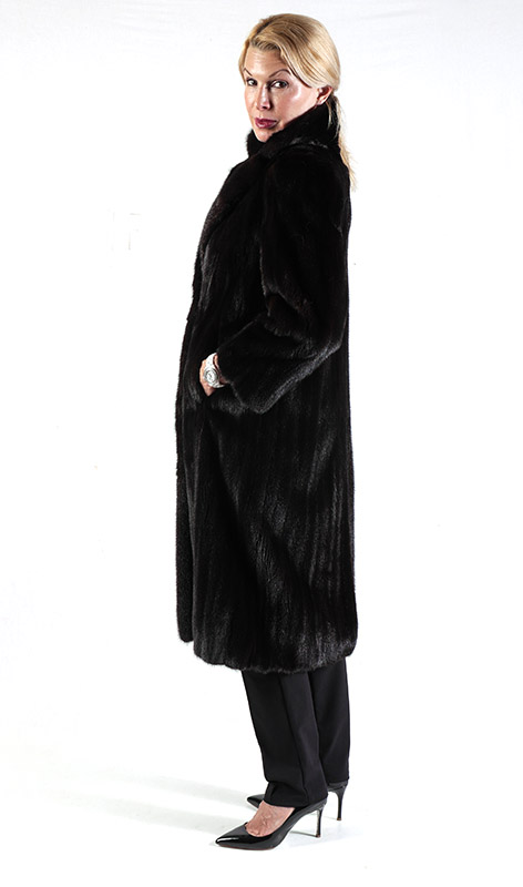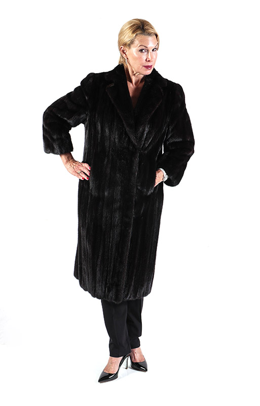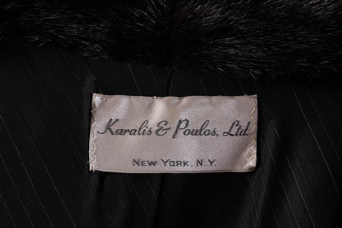 FULL LENGTH BROWN FUR COAT: Stand up collar. Coat is in very good condition. Karalis & Poulos LTD. NY label. Approximate size 4-6. Approximate measurements: 25'' from neck to sleeve cuff/hem, 14'' across back and 43'' length from neck to hem.