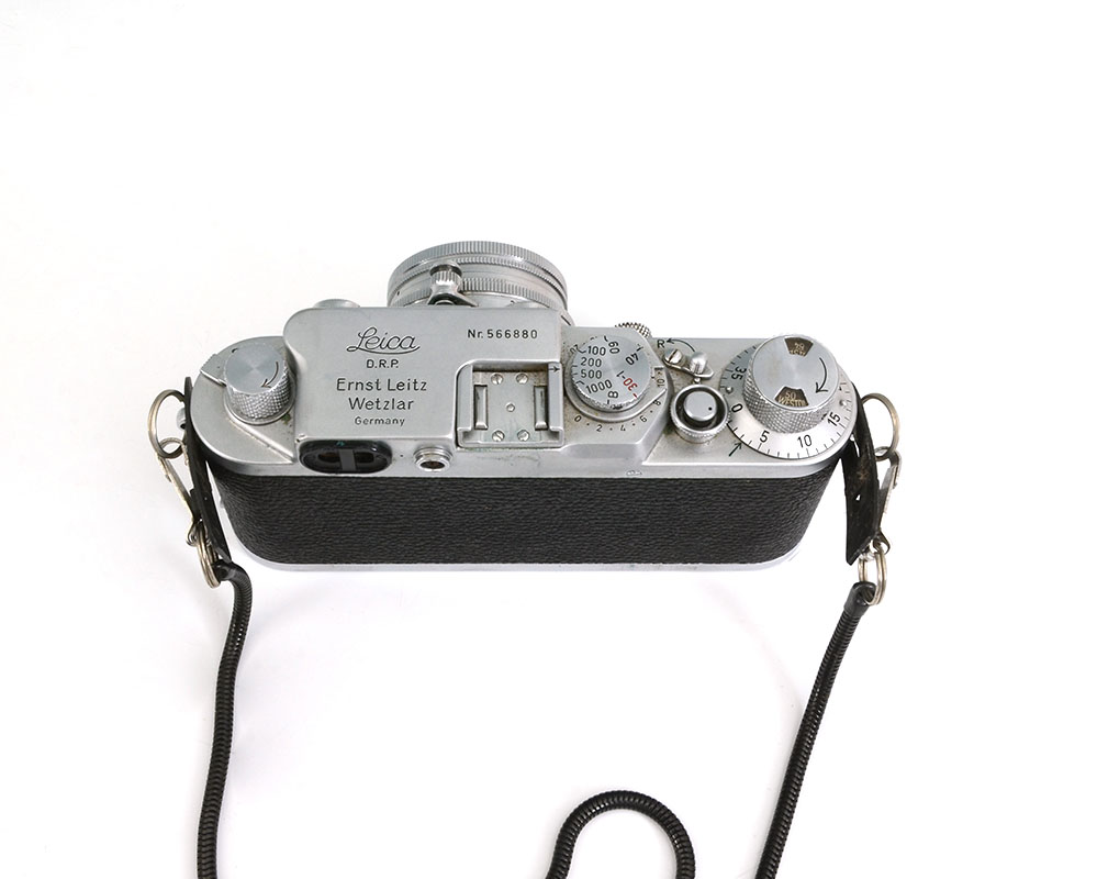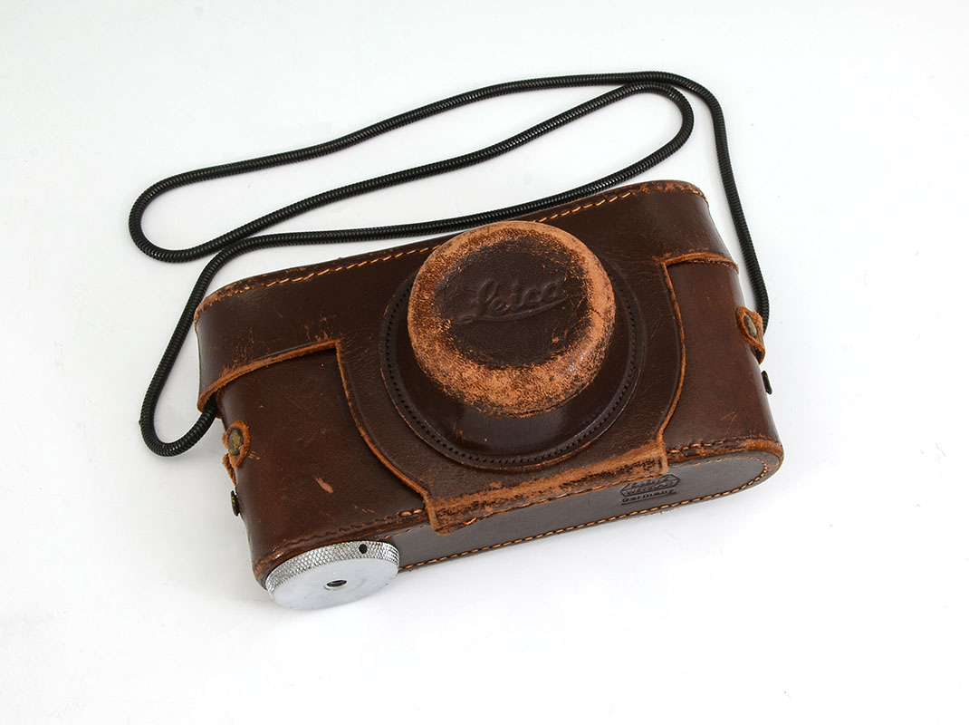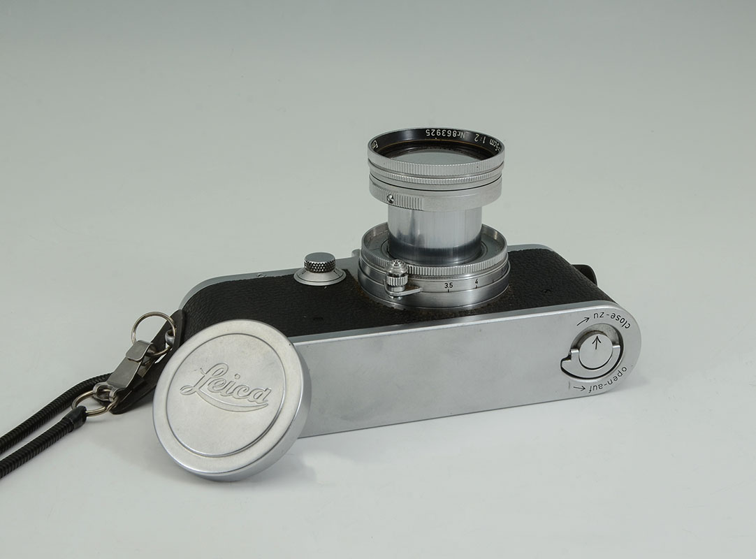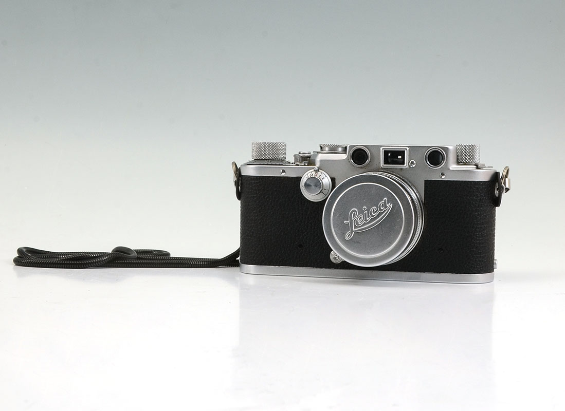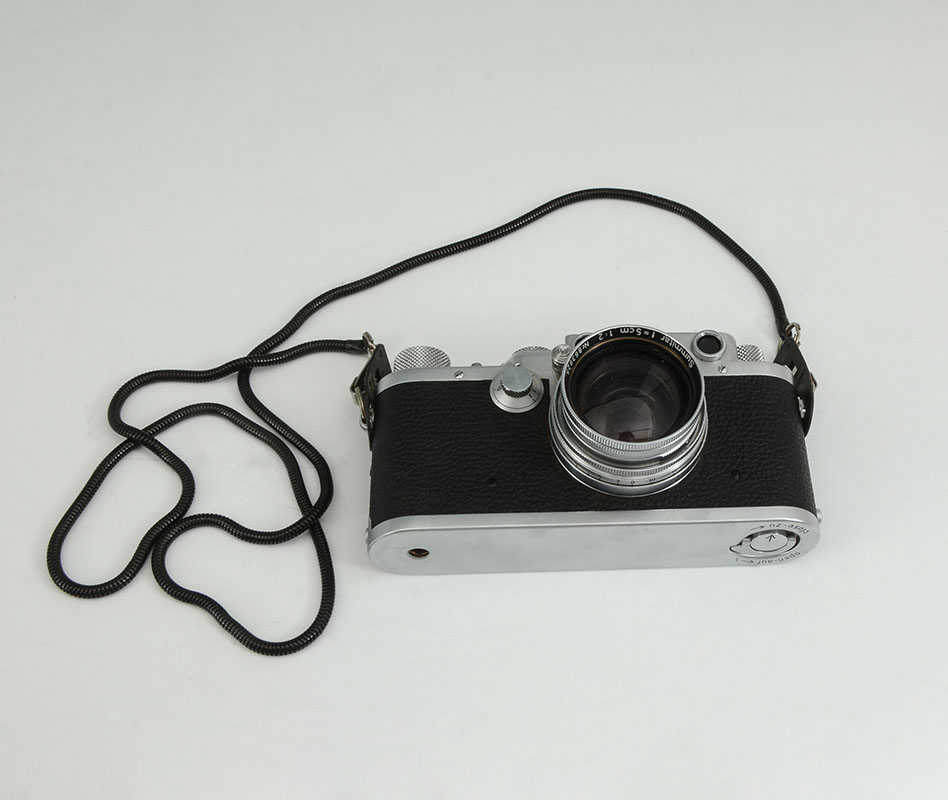 1951 LEICA IIIf CAMERA WITH f5 LENS: Serial number 566880, Ernst Leitz Wexlar faux sharkskin case, Summitar f=5cm 1:2 lens, leather outer case.