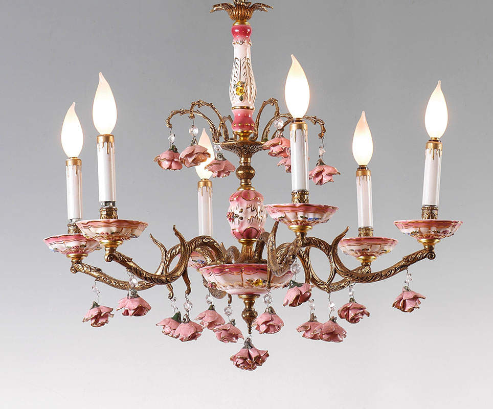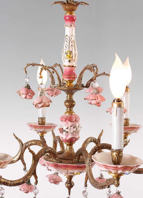 ITALIAN STYLE TOLE 6 LIGHT CHANDELIER: 6 foliate motif brass arms, pink, white and gilt decoration porcelain insets and bobeche, hanging pink and white rose flower accents. Overall measures 24'' h. x 24''.