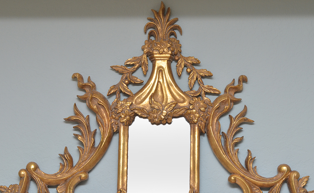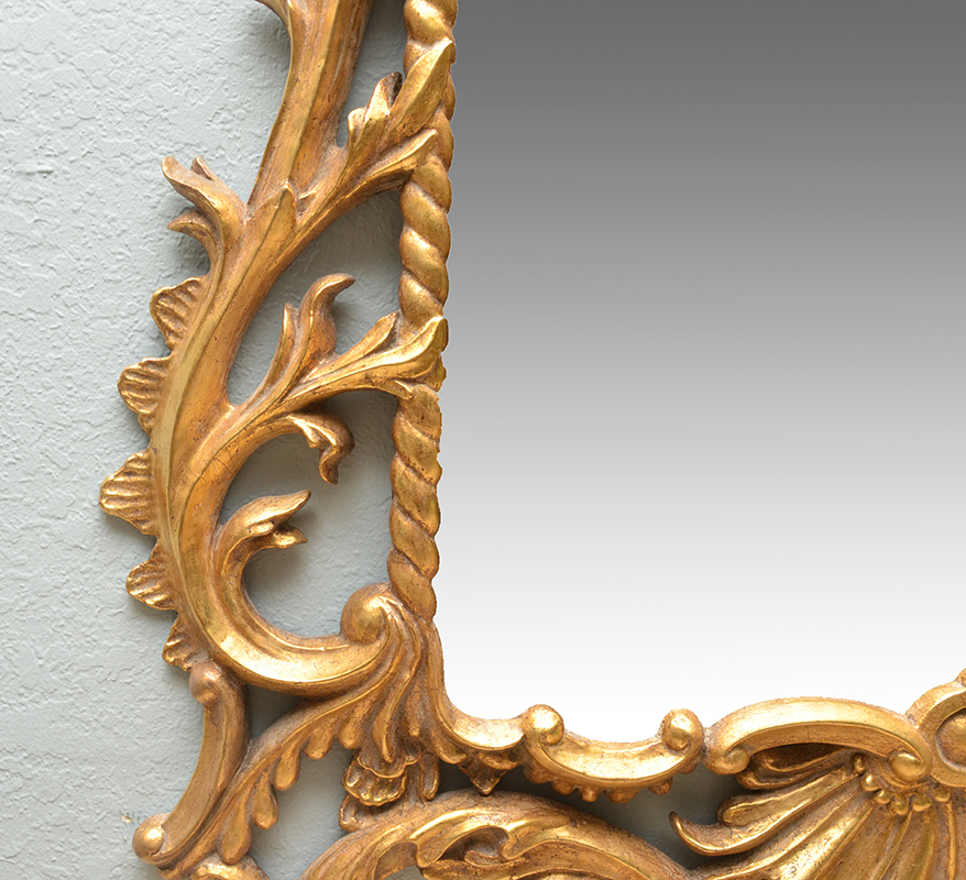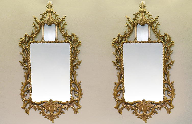 PAIR LARGE CHINESE CHIPPENDALE STYLE MIRRORS: Contemporary composite frames with reticulated foliate motifs. Small mirror above large mirror, overall measures 72'' h. x 37 1/2'' x 1 1/2''.