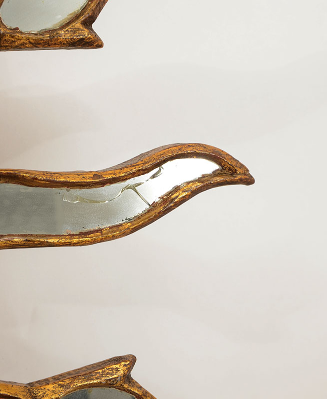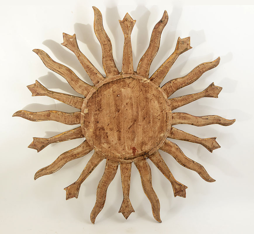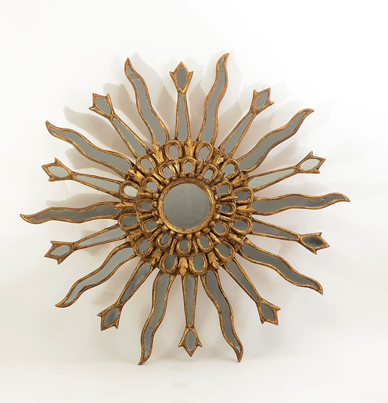 PERUVIAN SUNBURST STYLE WALL MIRROR: Layer levels of inset mirror panels in carved gilt wood, overall measures 30'' dia. x 3 3/4'' deep.