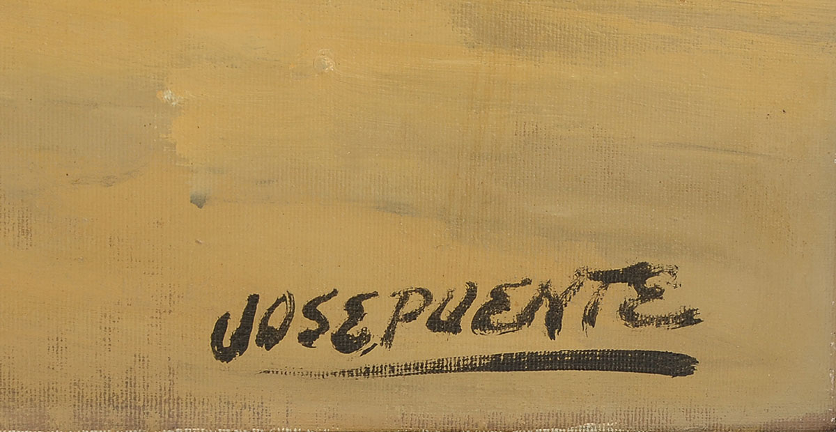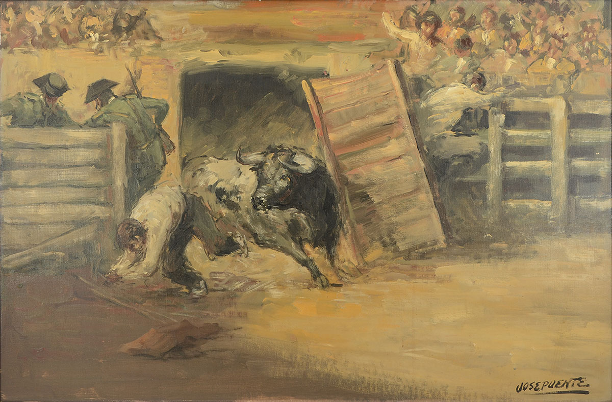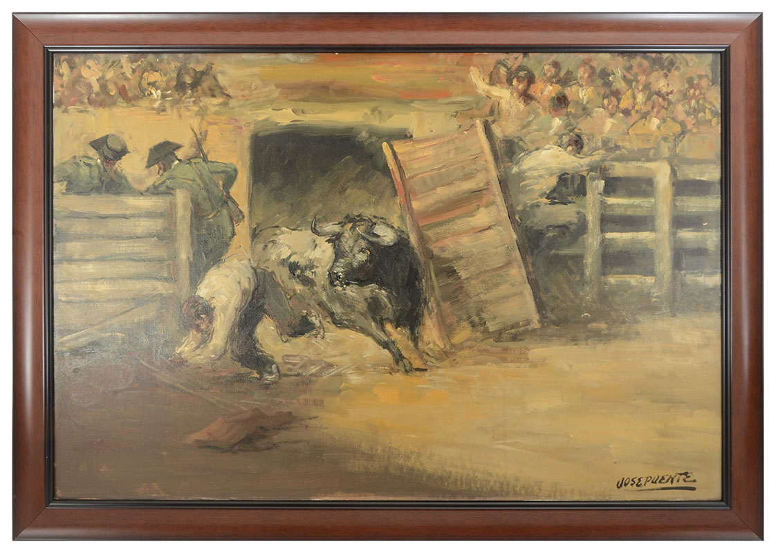 PUENTE, Jose, (Spanish, 1928-2002): Angry Bull Escaping from the Shoot, Oil/Canvas, 23.5'' x 35.5'', signed lower right, frame, 28'' x 39.5''. Jose Puente is known for painting.