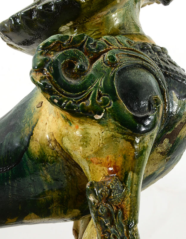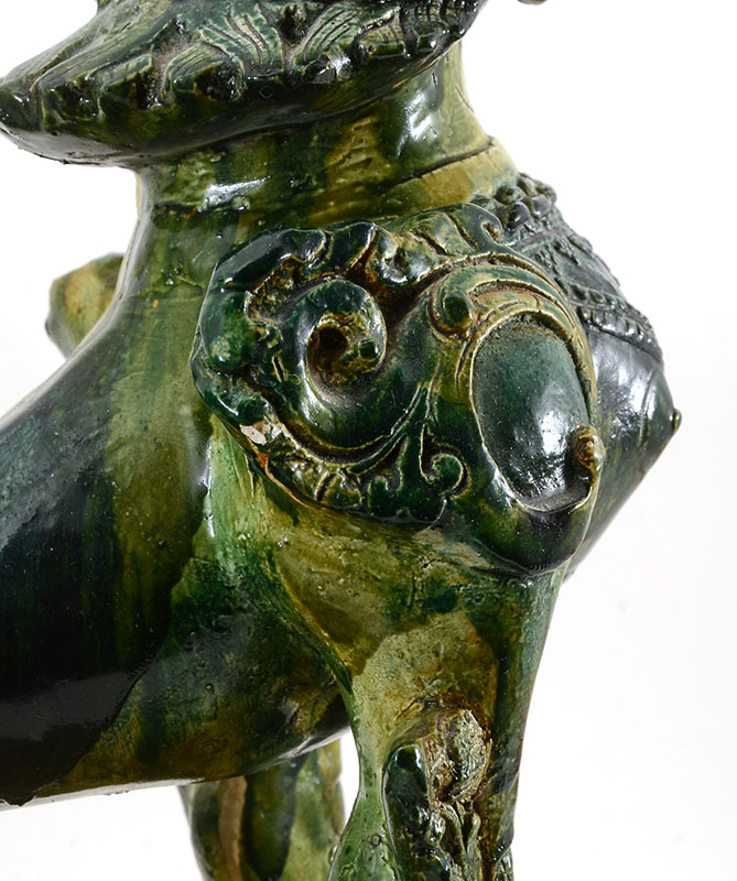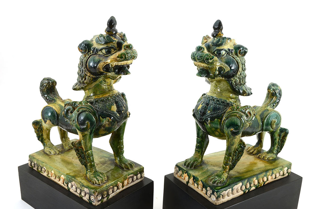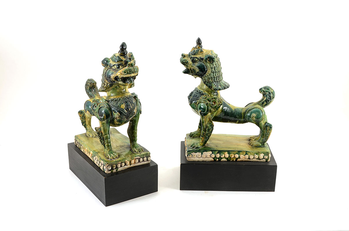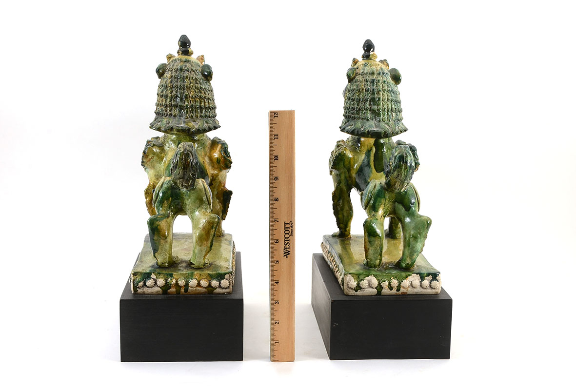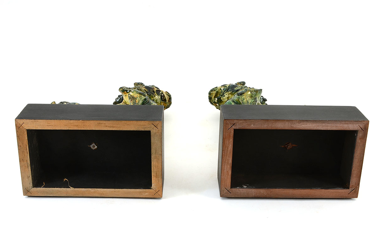 PAIR CHINESE GLAZED TEMPLE / FOO LIONS: Polychrome glazed in green and yellow hues ceramic temple or foo lions attached to black painted wood base. Overall on base measure 15 1/2'' h. x 10'' x 6''.