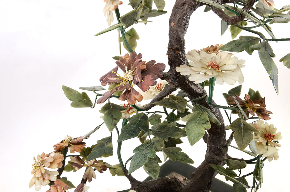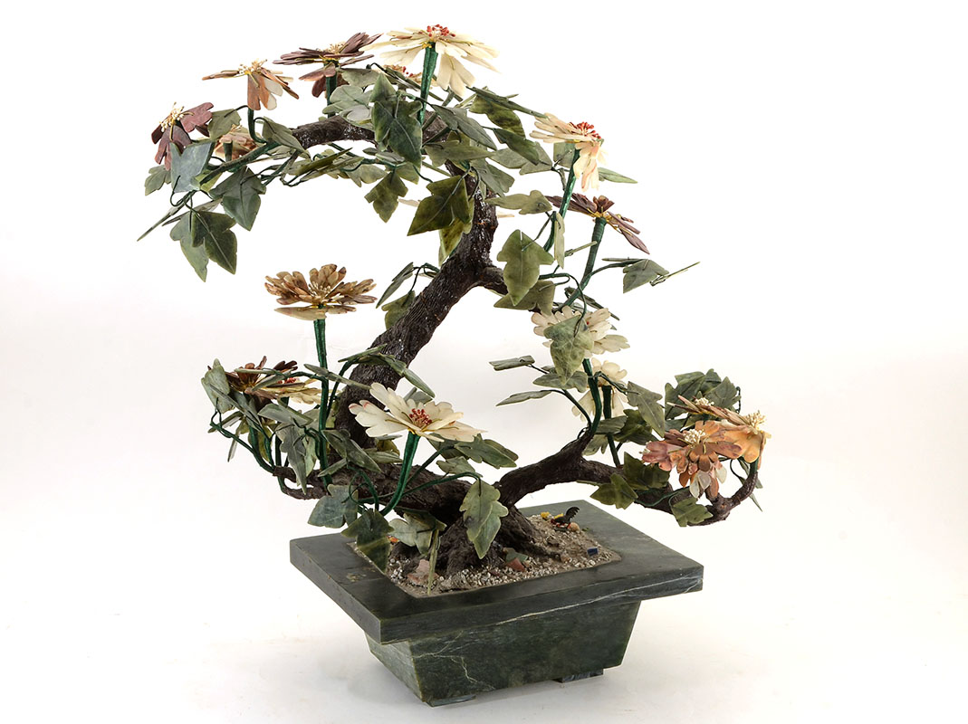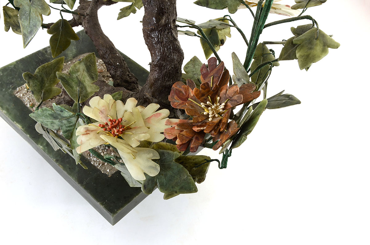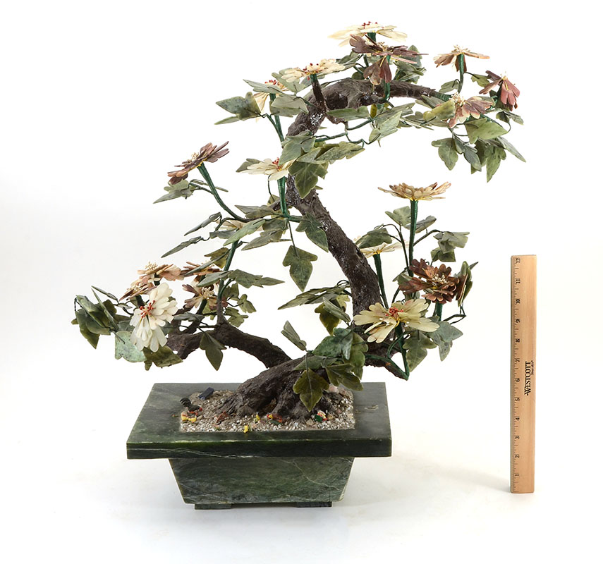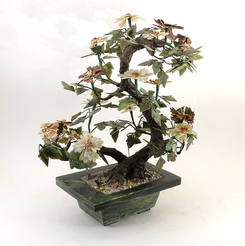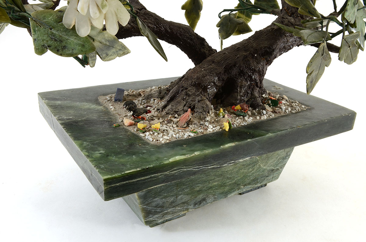 LARGE CHINESE JADE TREE: Green stone pot, composite trunk and branches, jade or similar stone leaves and branches. Overall measures 23'' h. x 21'' x 12''.