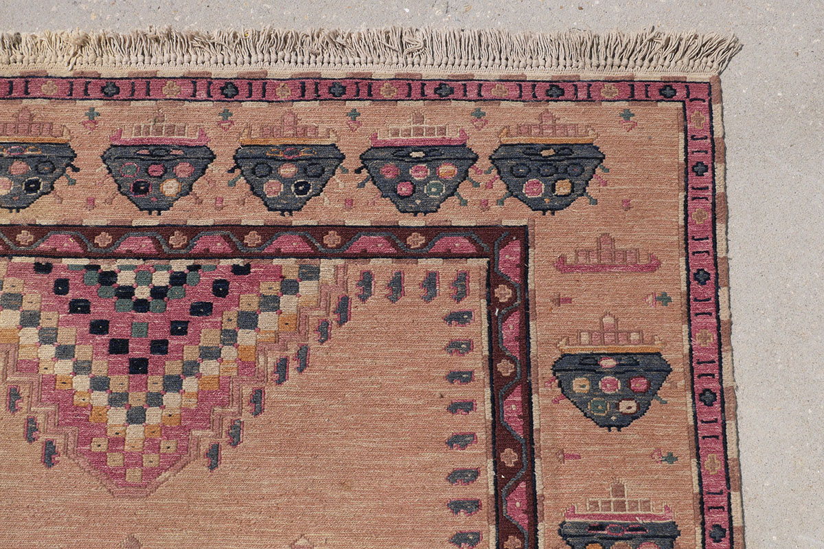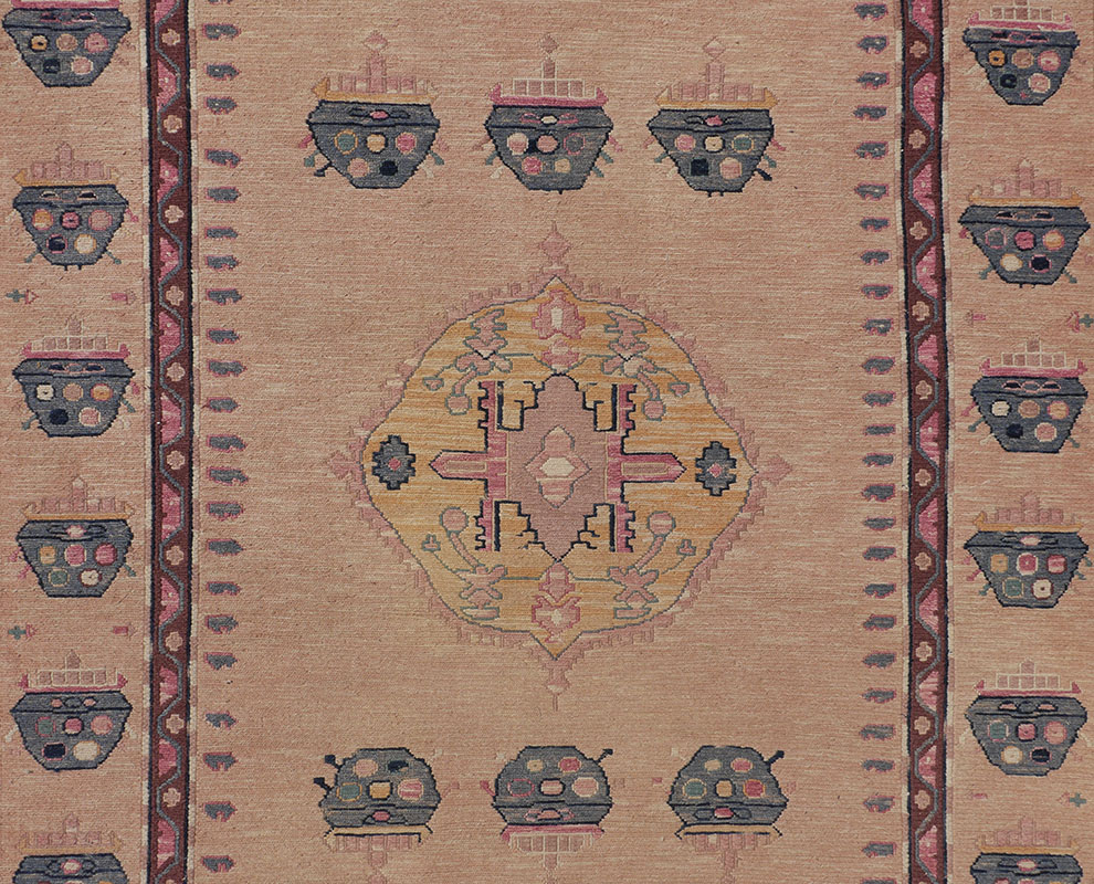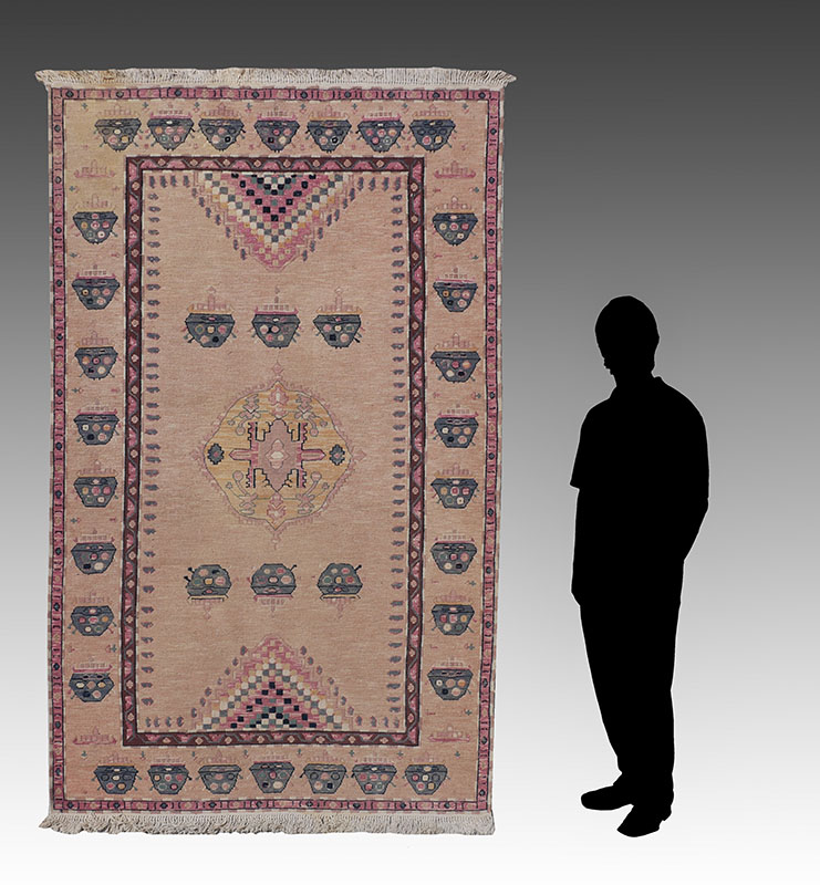 APPROX 20-35 YR OLD TURKISH SOUMAK HAND WOVEN WOOL RUG, 5'5'' X 8'1'': This rug has an interesting design that includes stepped multicolored ''pyramids'' or triangles at each end of the ivory field pointing in to the center. A row of three footed dark colored vases with pale squarish buds come next and this motif is repeated in the main border of the rug. (They look like flying saucers!). In the center of the rug is a pale-yellow ovoid medallion.