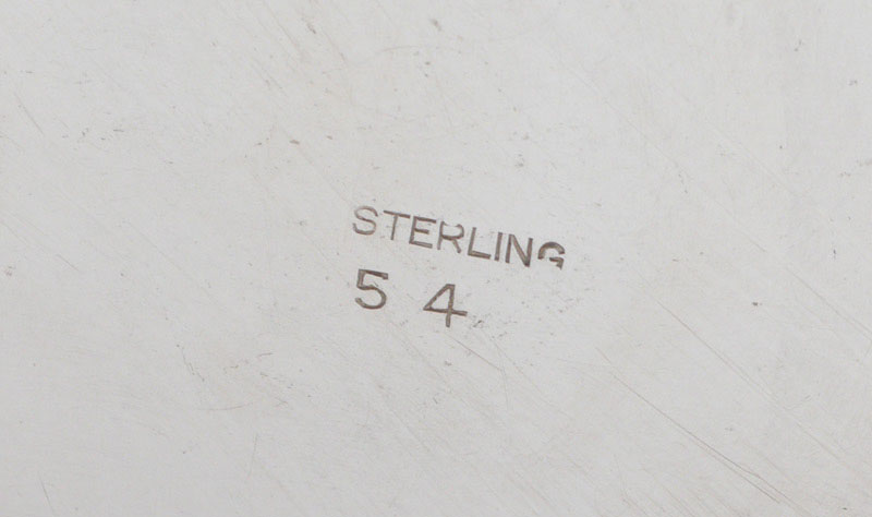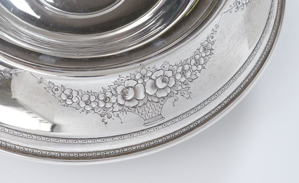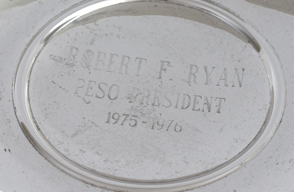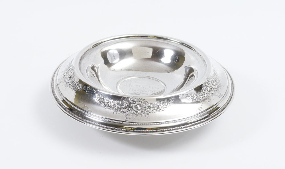 LARGE STERLING PRESENTATION BOWL: Pedestal bowl with embossed floral motifs on elongated rim. Engraved presentation center of bowl ''Robert F. Ryan, PESO President, 1975-1976''. Simply marked Sterling, 54. 3 1/4'' h. x 11 1/4'' dia., approx. 10.6 troy oz.