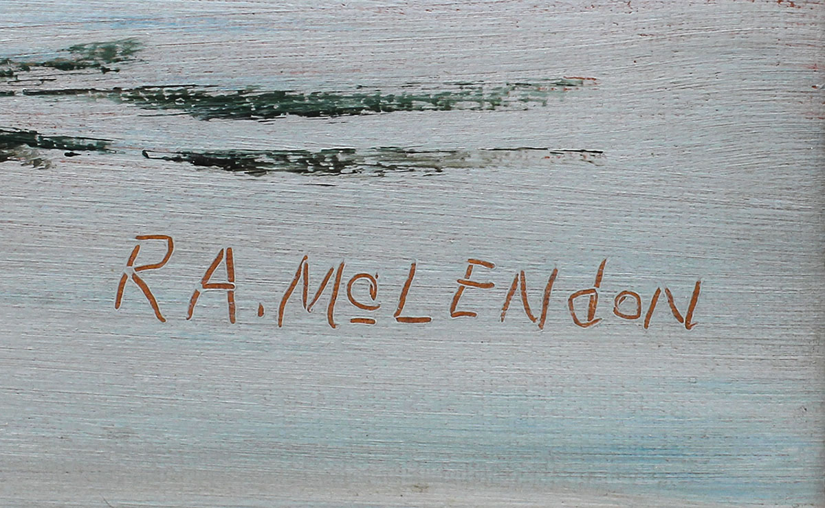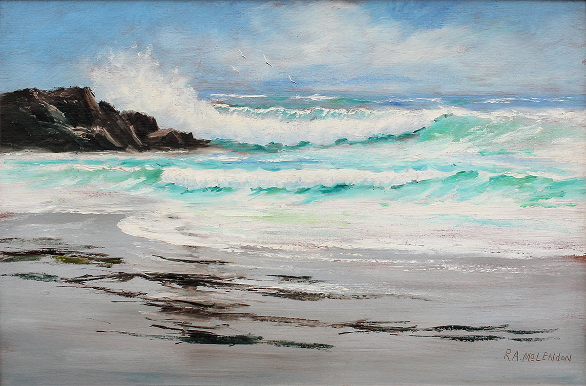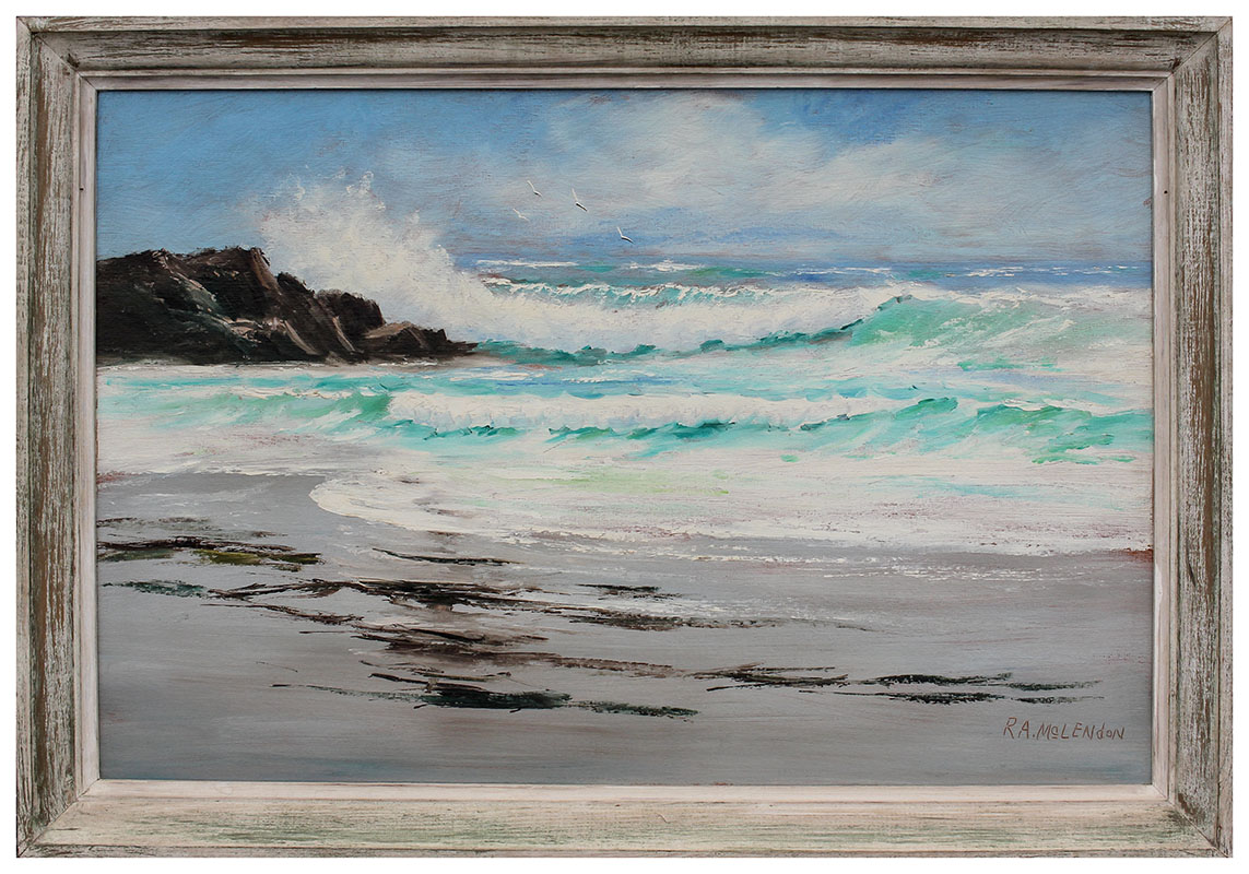 MCLENDON, Roy, (American, 20th Century): Florida Highwaymen crashing surf at the Ft. Pierce Jetty, Oil/Upson, signed lower right, 24'' x 36'', framed 27 1/2'' x 29 1/2''.