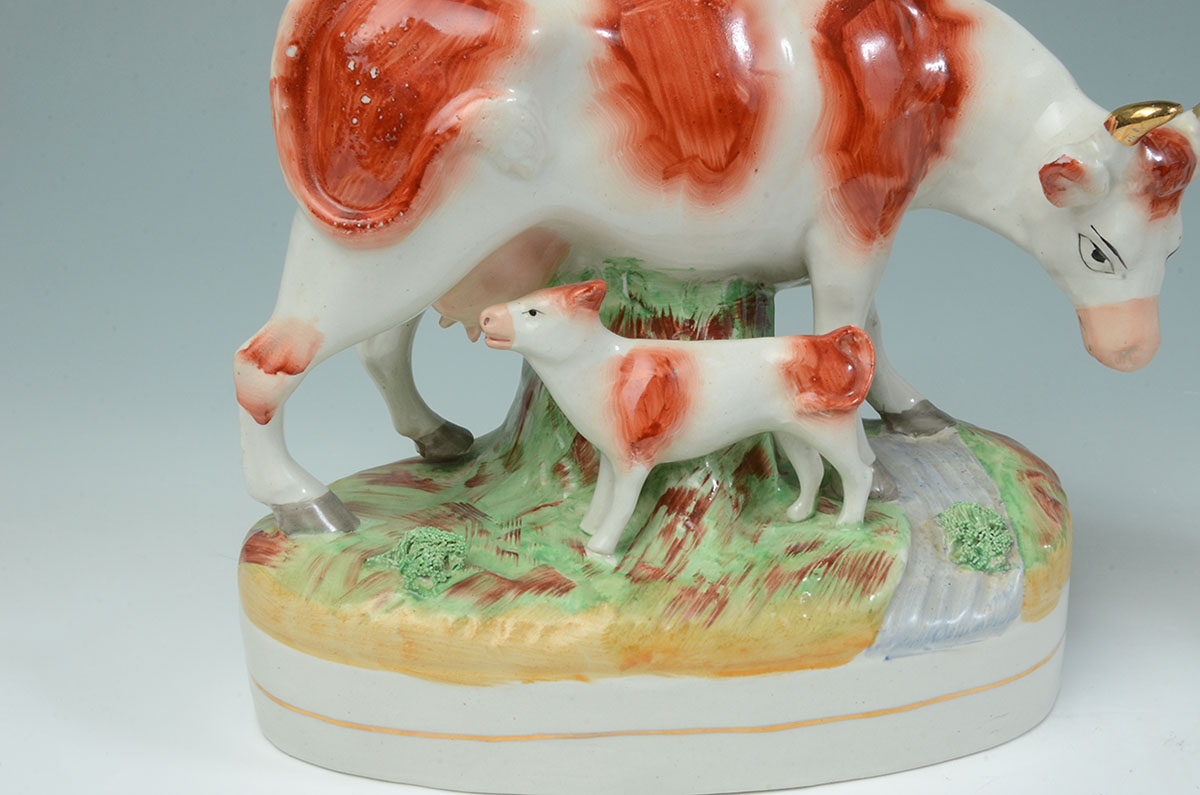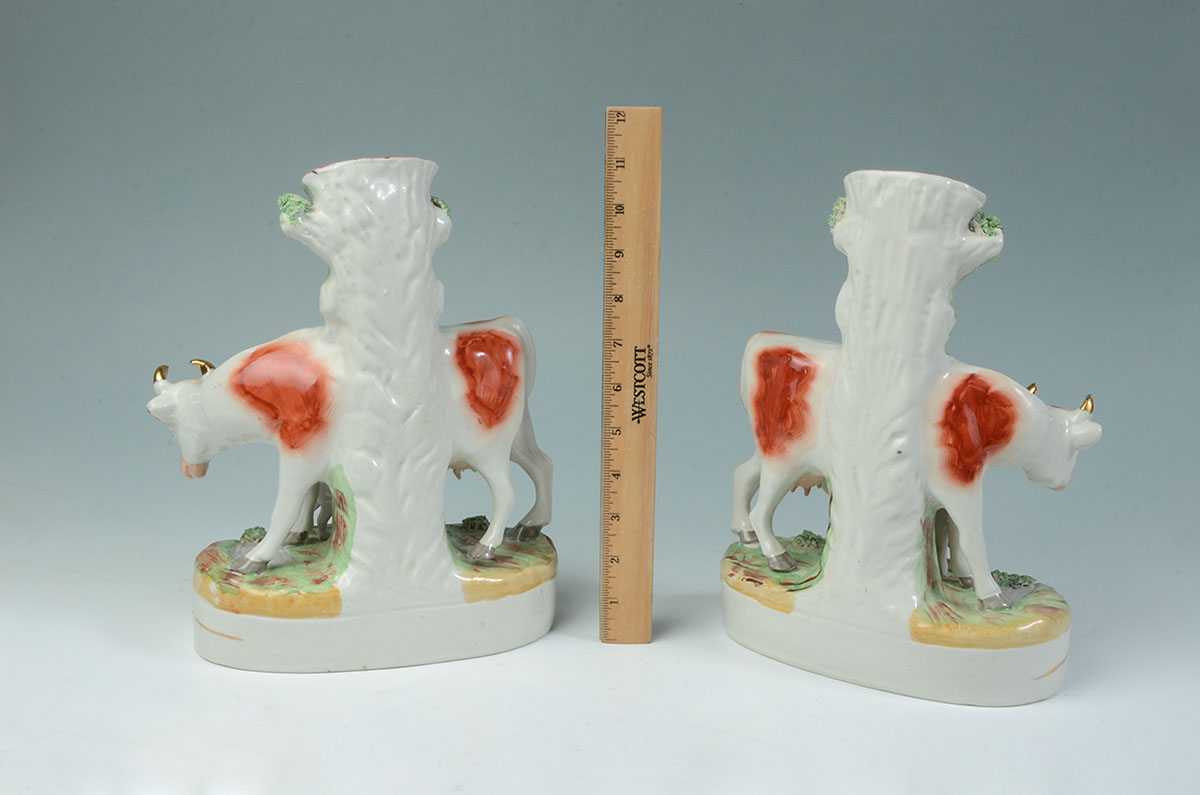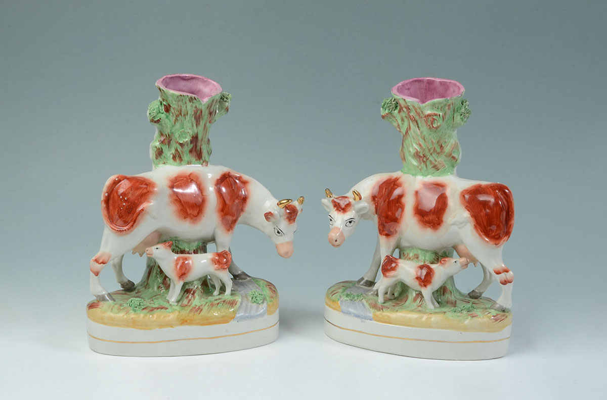 PAIR STAFFORDSHIRE FIGURAL COW SPILL VASES: Mirror image pair of cow and calf, applied foliage, red Staffordshire Ware England knot mark on bases. Overall 11'' h. x 8 1/2'' x 4''.