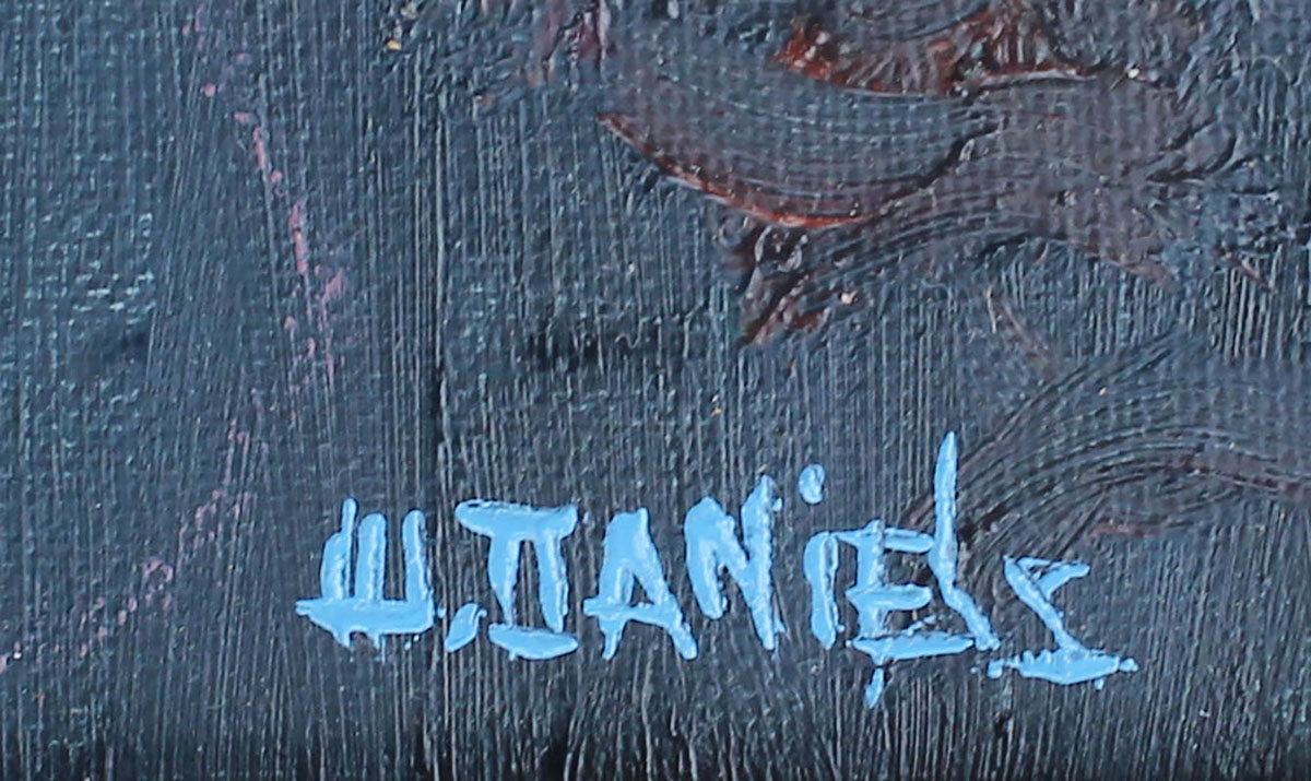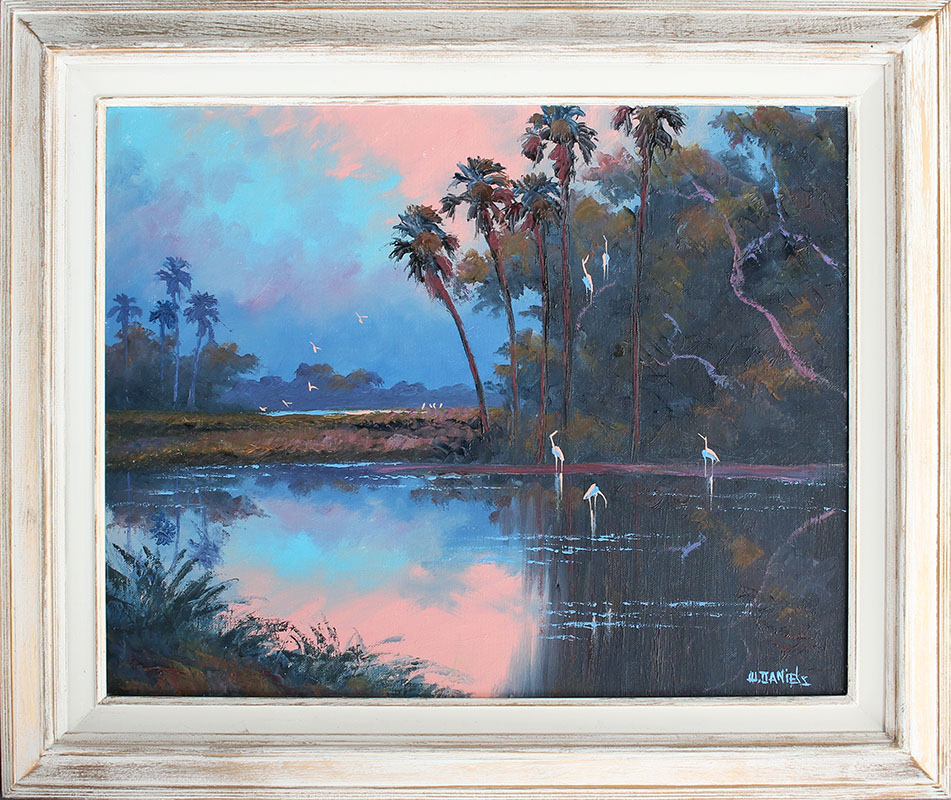 DANIELS, Willie, (American, 20th Century): Florida Highwaymen sunrise backwater scene with pink sky and birds, Oil/Canvas, 16'' x 20'', framed 21 1/2'' x 25 1/2''.