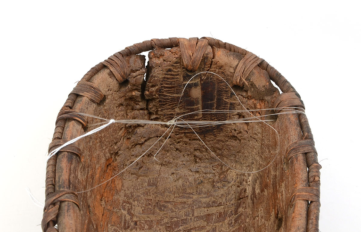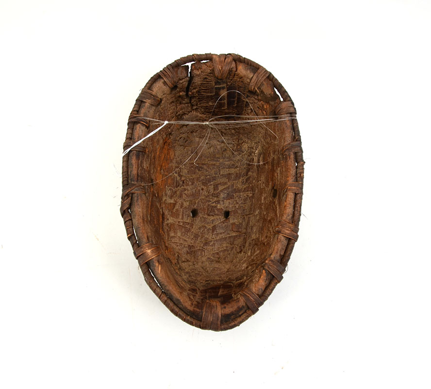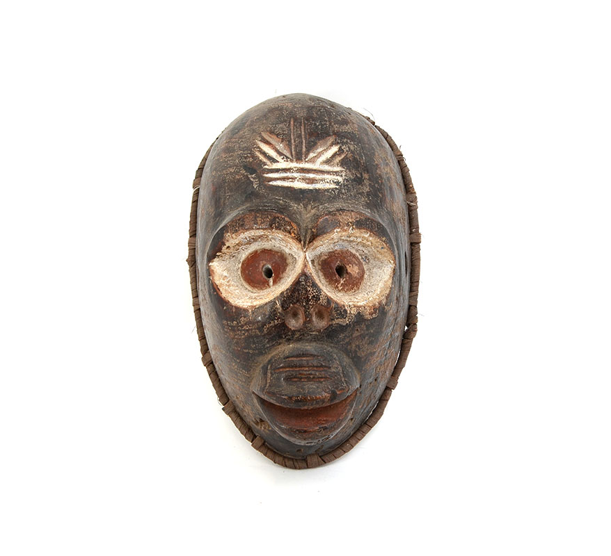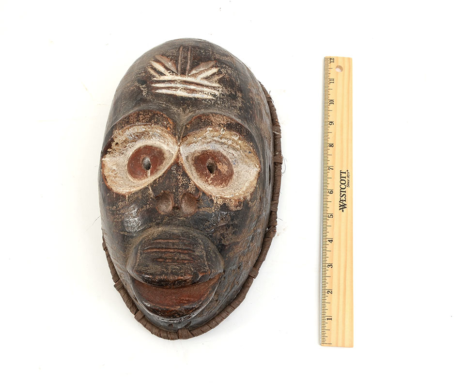 BAULE? IVORY COAST CARVED MONKEY MASK: Carved wood with white paint in eyes, woven border, possibly Baule Tribe, mid 20th century, 11 1/2'' h. x 7 1/4'' x 5''.
