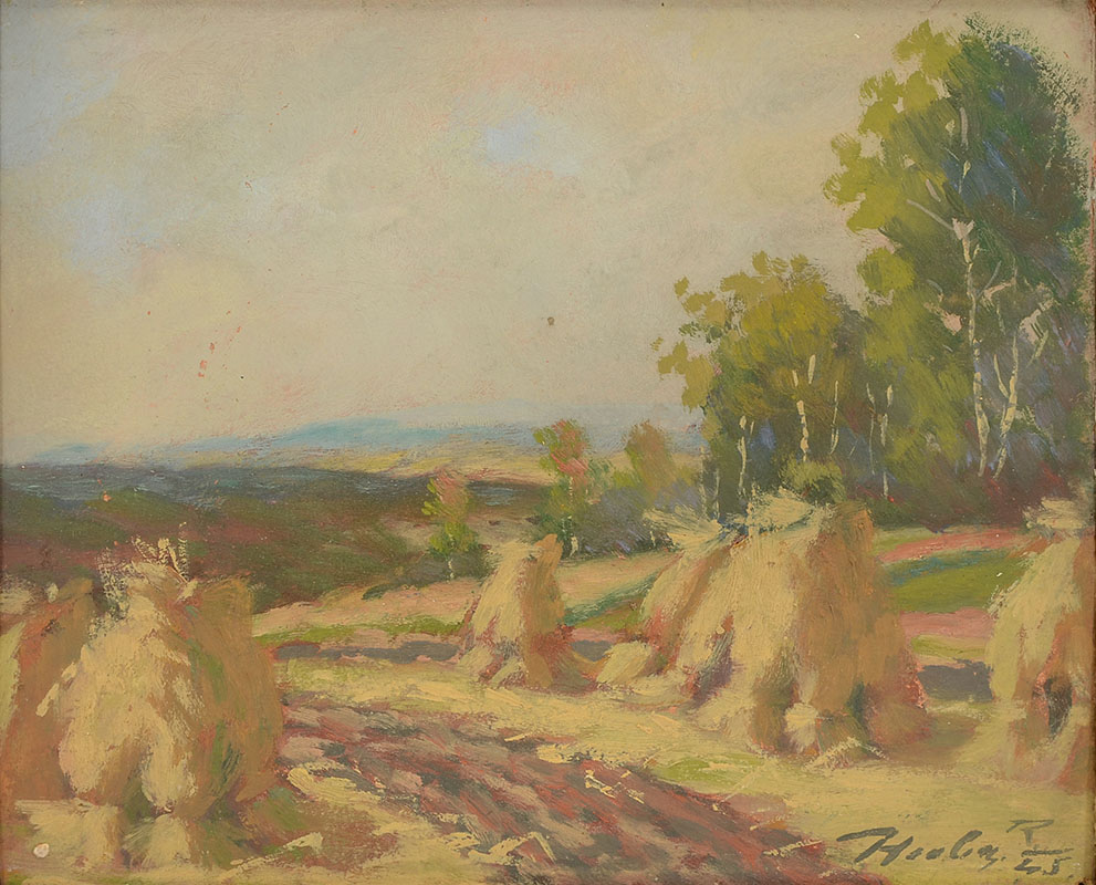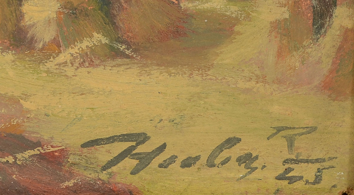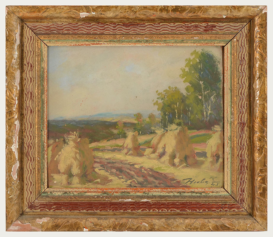 ILLEGIBLY SIGNED PAINTING OF HAYSTACKS: Oil/Canvasboard, sight size 8.5'' x 10.5'', signed lower left, gilded gesso frame, 13.25'' x 15.25''.