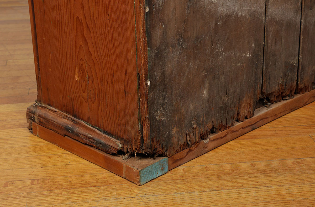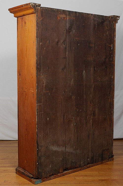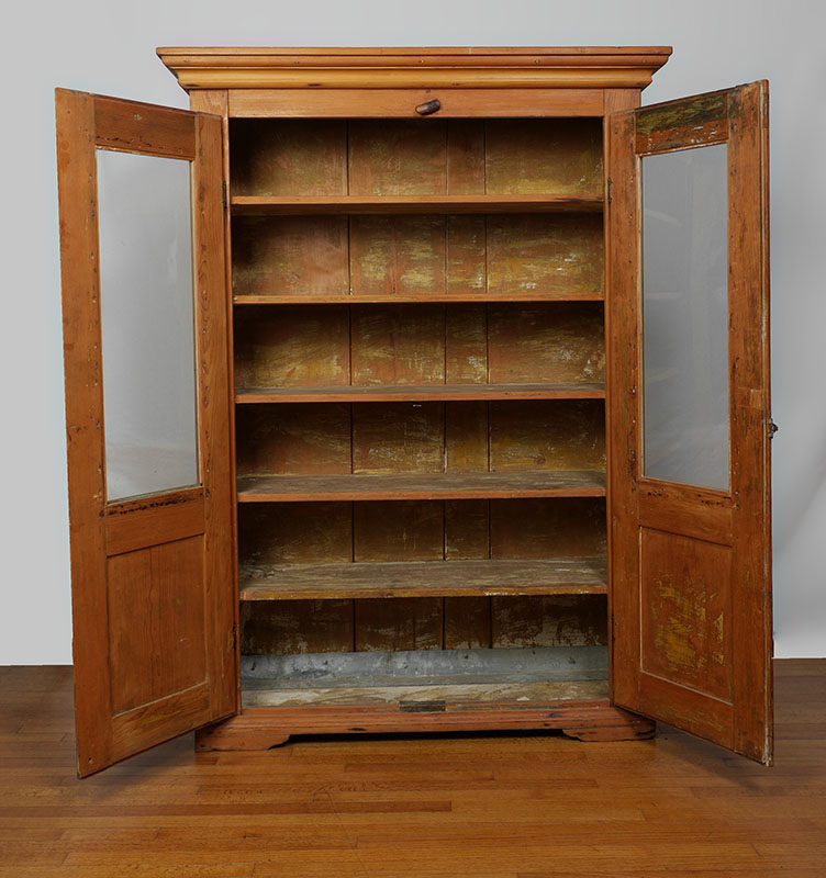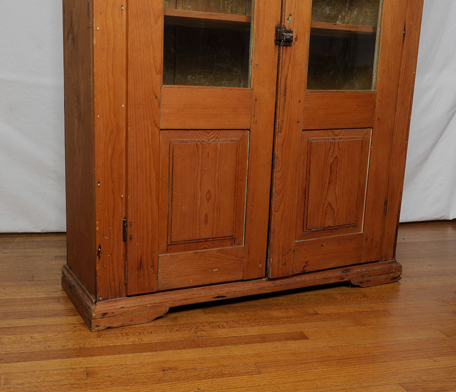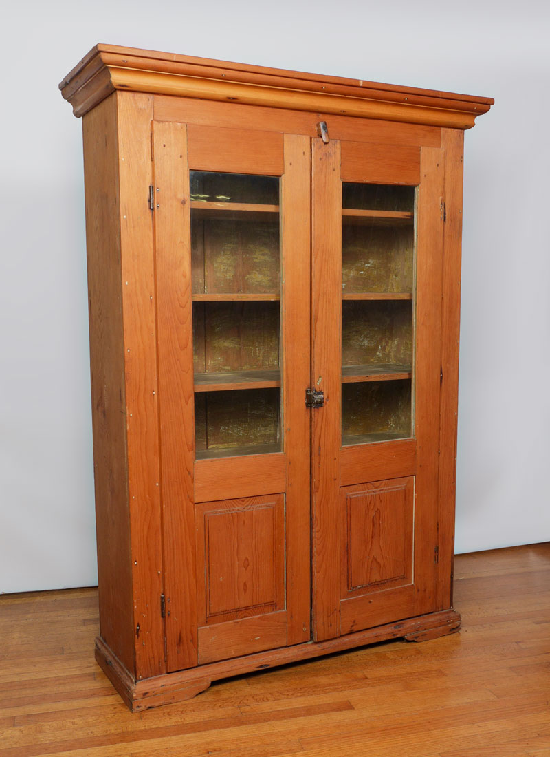 2 DOOR PINE COUNTRY CUPBOARD: Stepped cornice, two 3/4 length glass doors, 5 fixed wood shelves, pegged and nail construction, overall 74'' h. x 53 1/4'' x 18 1/4''.