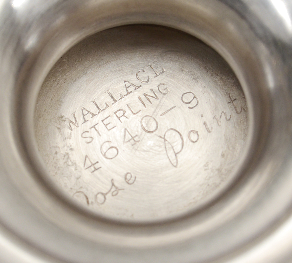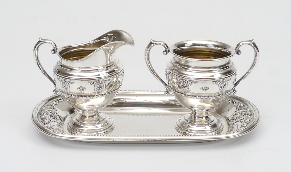 WALLACE ROSE POINT STERLING CREAMER, SUGAR, & TRAY: 3 pieces total in the Rose Point pattern by Wallace to include open creamer (4 1/4'' h. x 7 5/8''), open sugar (4'' h. x 5''), tray (10 1/2'' x 5 1/2''). Approx. 12.8 troy oz.
