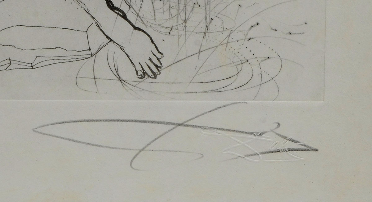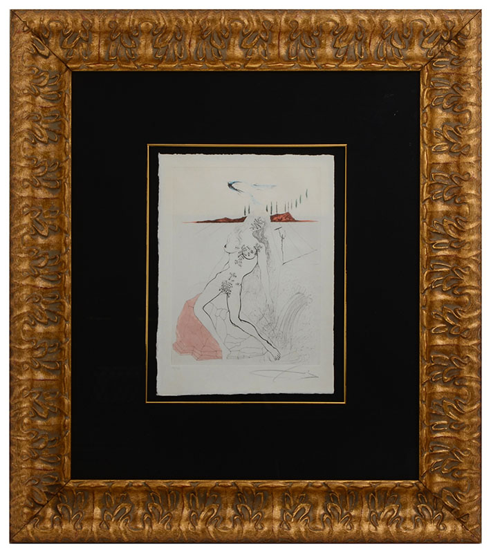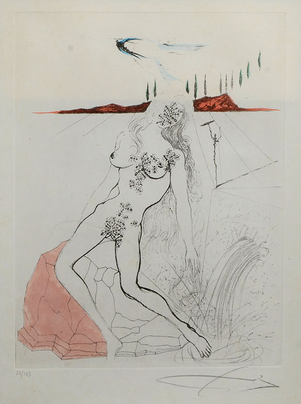 DALI, Salvador, (Spanish, 1904-1989): Femme a la Fontaine, Hand Colored Etching, 9.25'' x 12.5'', signed in pencil lower right, numbered 24/145 lower left, fine custom framing, 34'' x 30''.