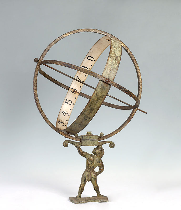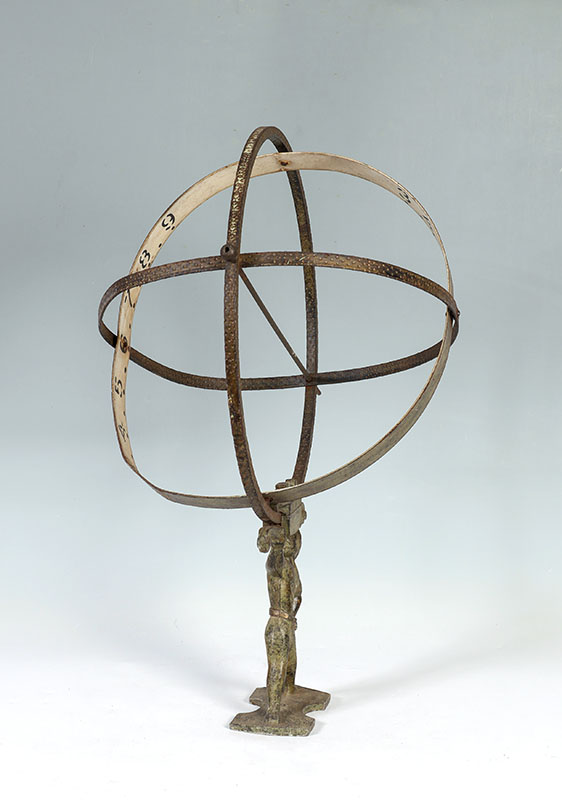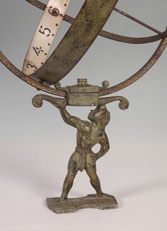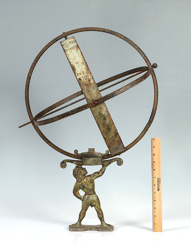 FIGURAL ATLAS MIXED METAL ARMILLARY: Figure of Atlas in loin cloth supporting iron armillary spheres, missing arrow. Overall 27'' h. x 20'' x 16''.