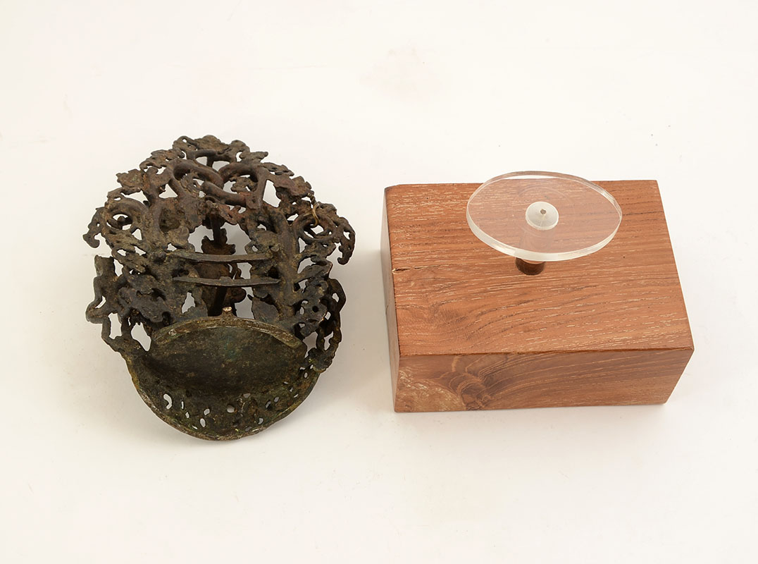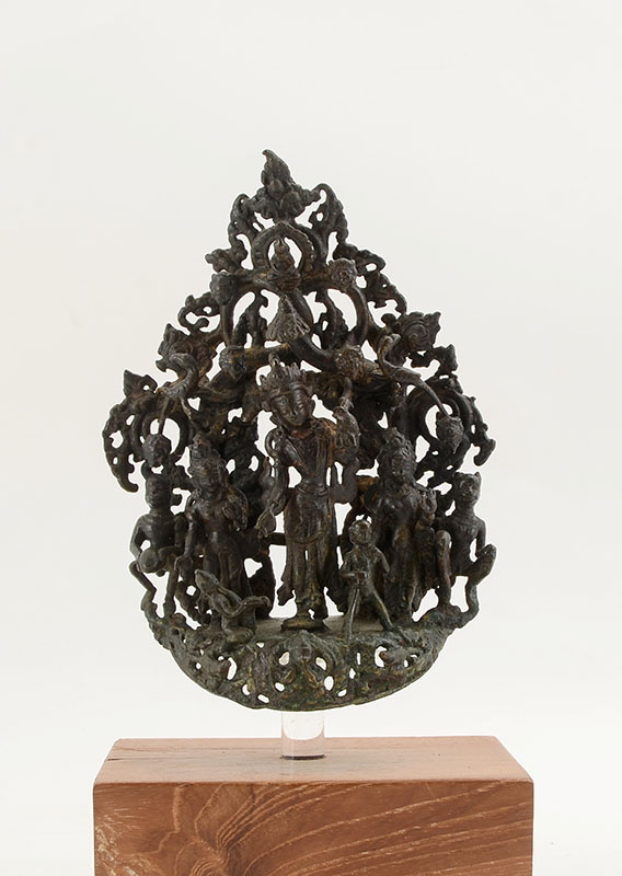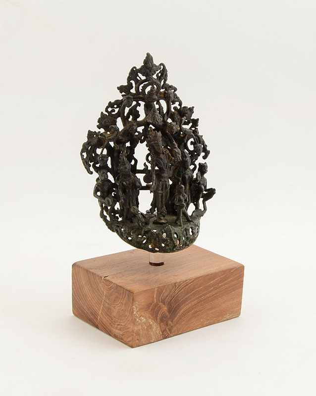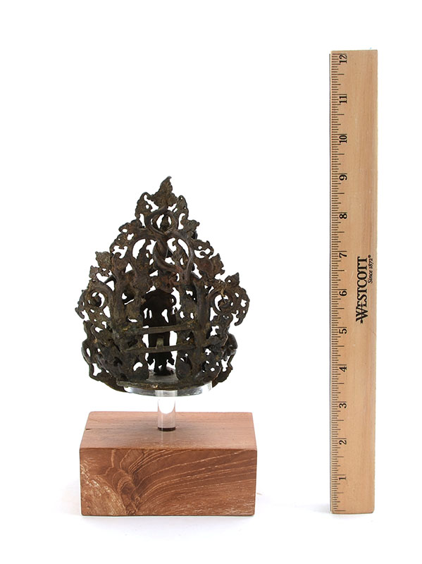 THAI CAST METAL BODHISATTVA FIGURAL GROUP: Figure of Buddhist deity and attendants, with tree background, measures 6 1/4'' h. x 4 1/2'' x 2''. Sold with a wood and Lucite stand, 3 1/4'' h. x 4 5/8'' x 3 3/8''. Actual age unknown.