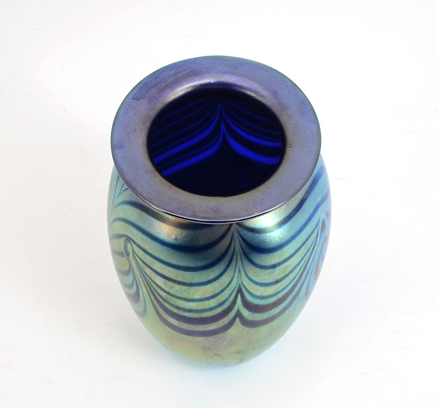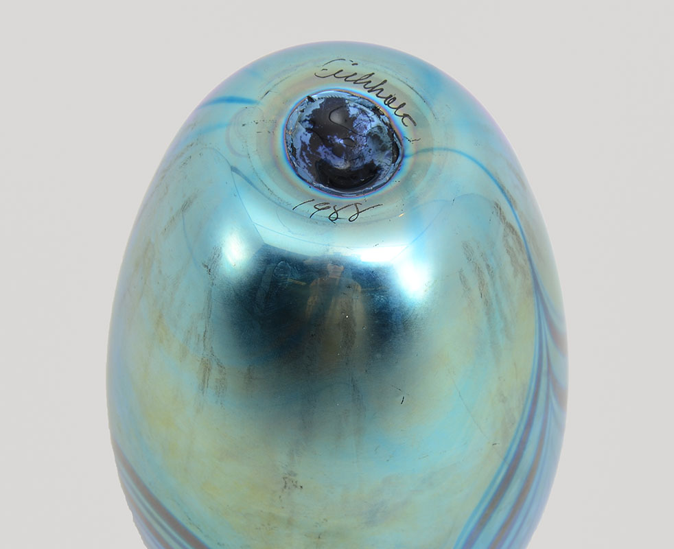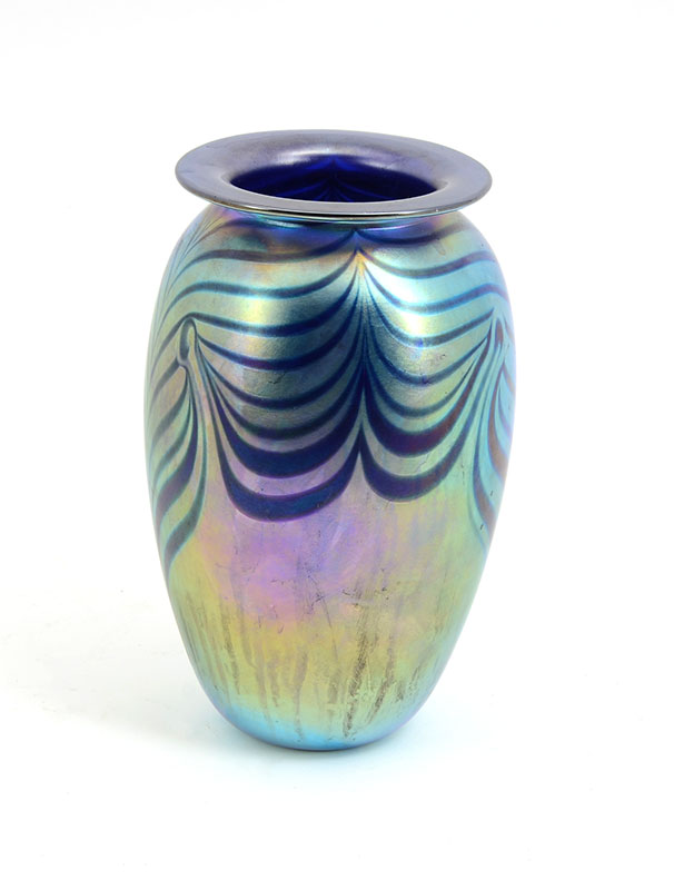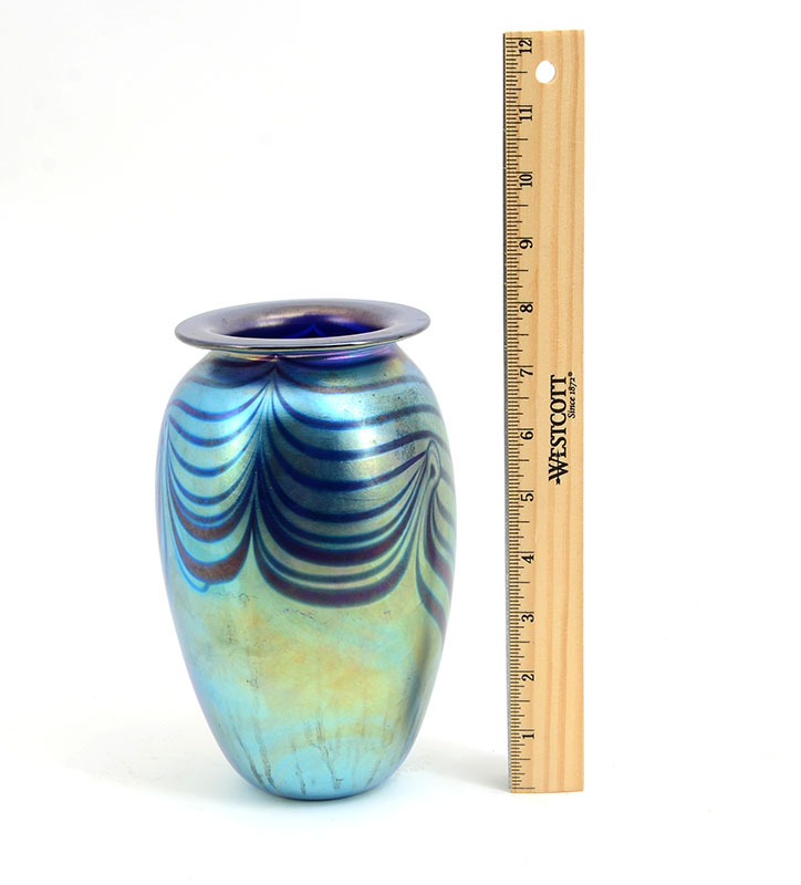 1988 EICHOLT ART GLASS VASE: Iridescent pulled feather design, signed and dated 1988. 7 3/4'' h. x 4 3/4''. Sold with 2 glass paperweights to include 1) Vandermark pulled feather, dated '85, 2 3/4'' h. 2) Iridescent ovoid signed MH '83, 2 1/2'' h.