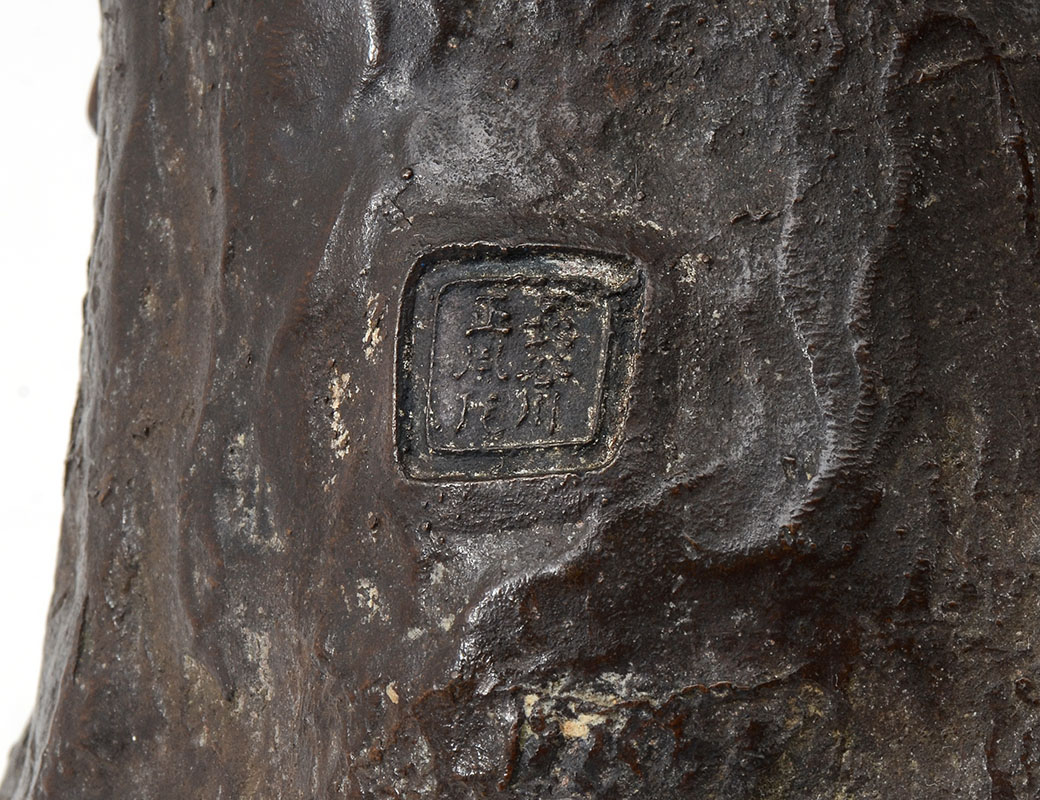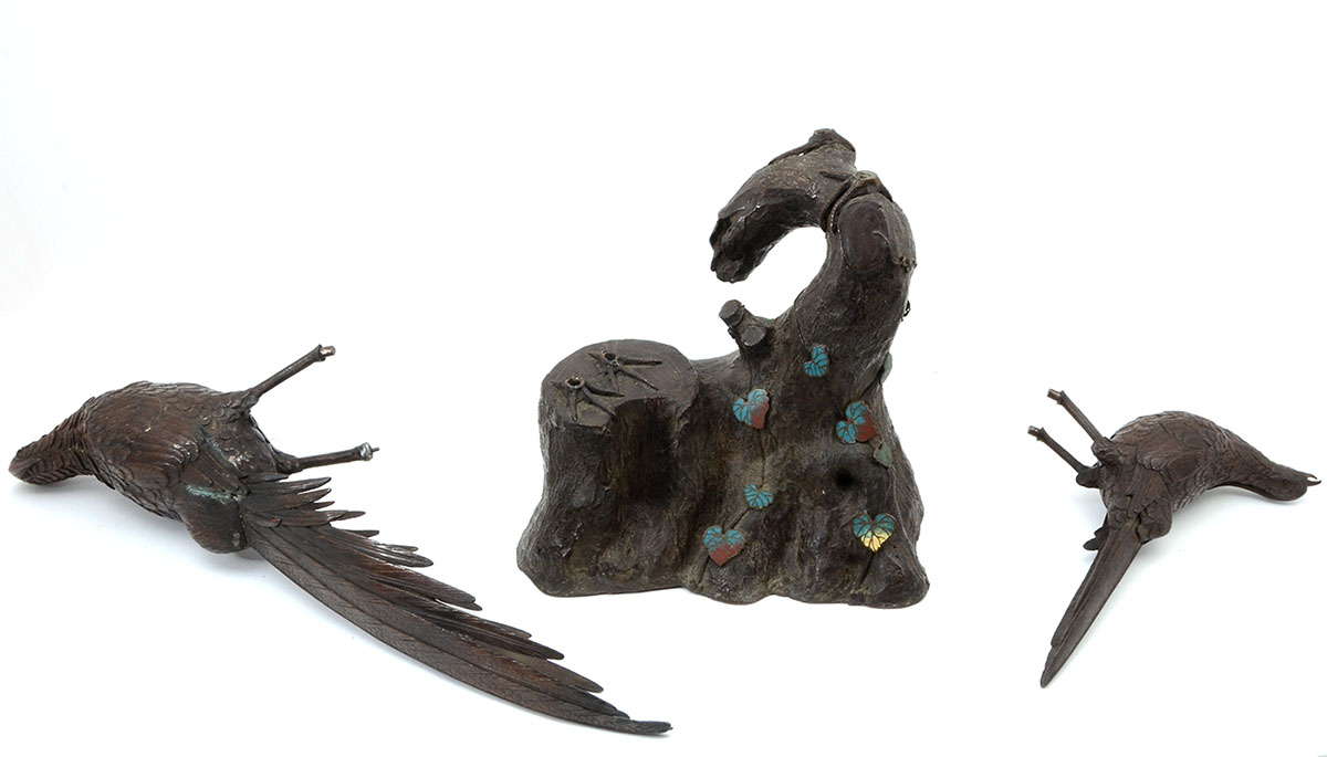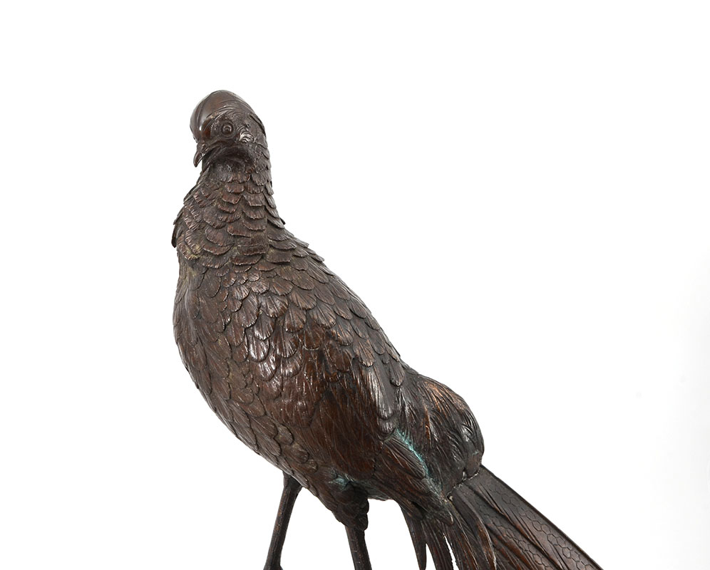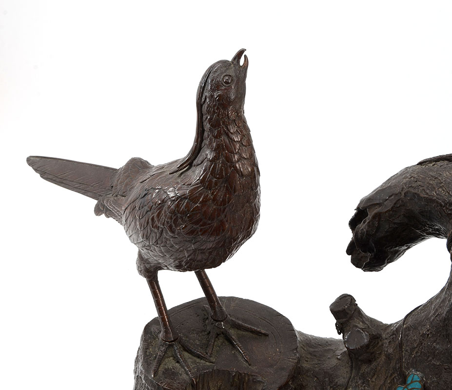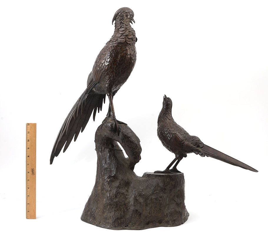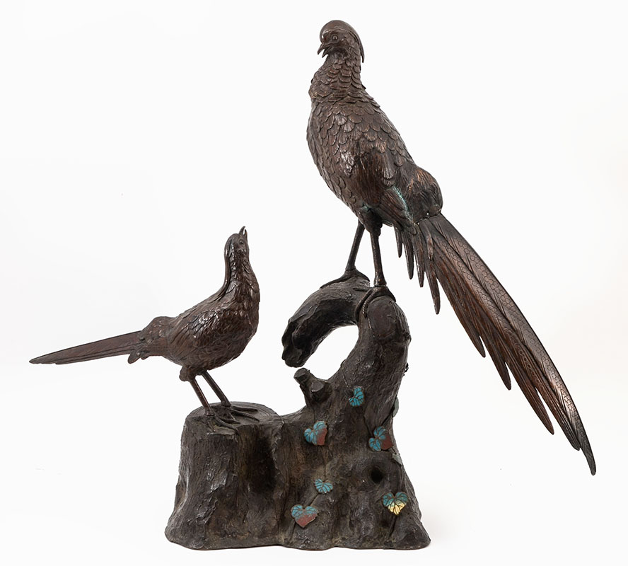 JAPANESE MEIJI PERIOD BRONZE PHEASANTS FIGURAL GROUP: Large figural group of a pheasant hen and cock, both removable from bronze stump form base with cloisonne leaves, signed on back. Overall measures 26 h. x 29 1/2'' x 15''.