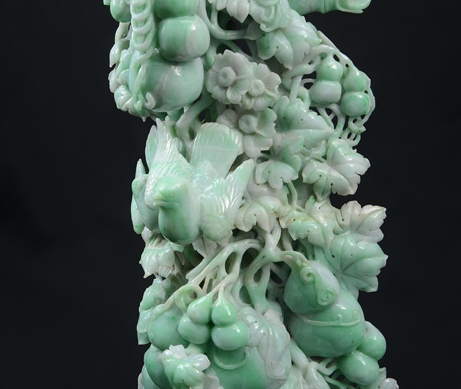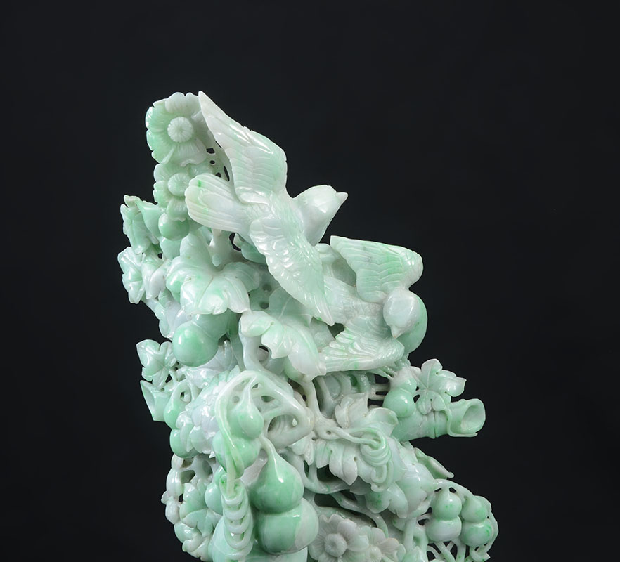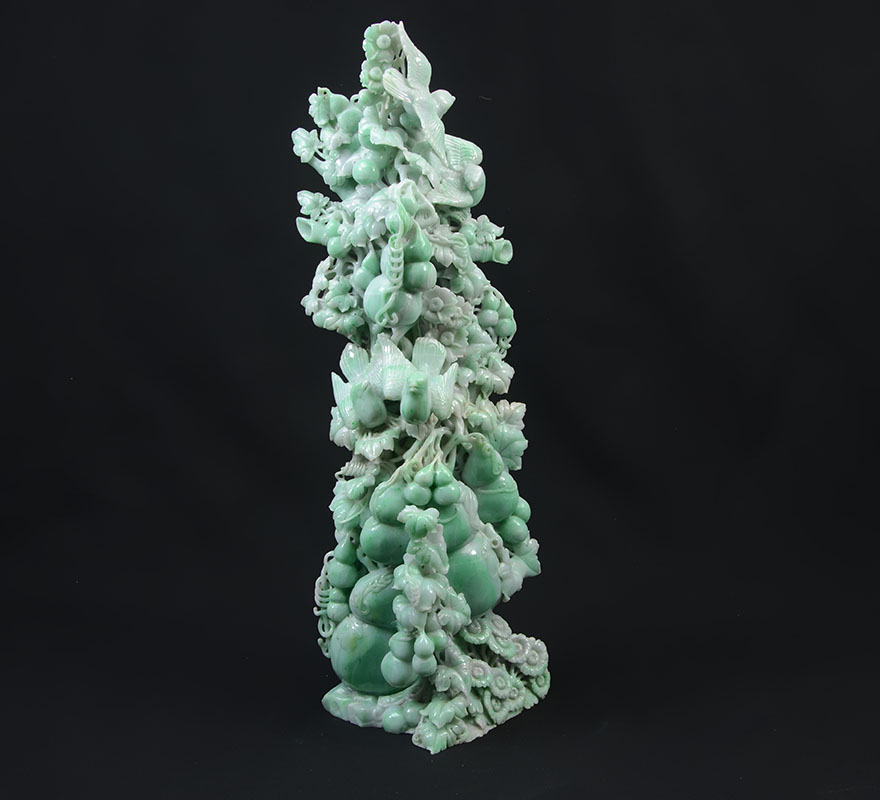 CARVED JADEITE GOURD VINE WITH BIRDS FIGURAL GROUP: Apple green and white jadeite or similar stone tall figural group with gourd vines, birds and flowers. Overall measures 19 1/4'' h. x 7'' x 4''.