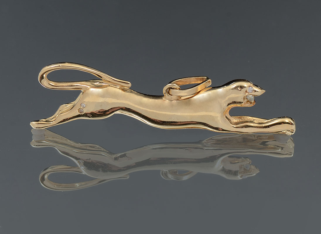 14K GOLD & DIAMOND JAGUAR PENDANT: 29.6 grams of 14K gold dotted with diamonds. Pendant is 2.75'' wide approx .925'' high.