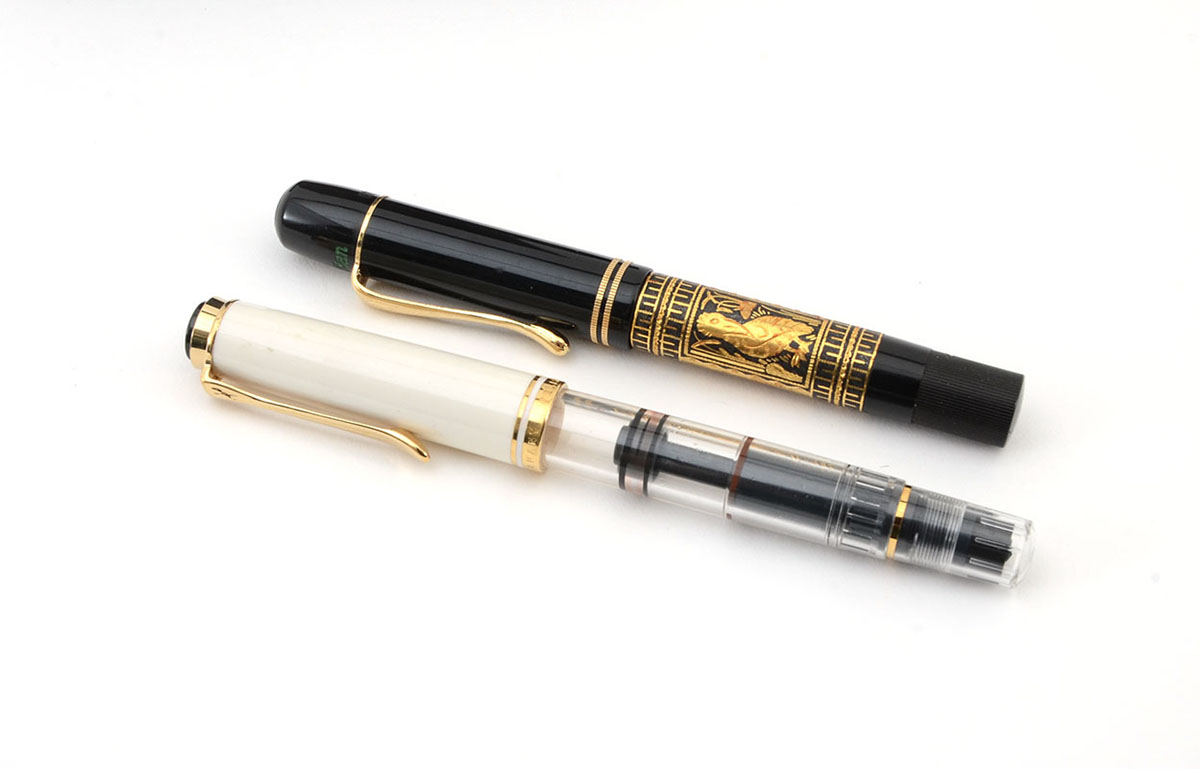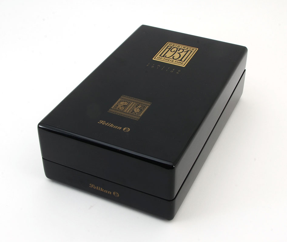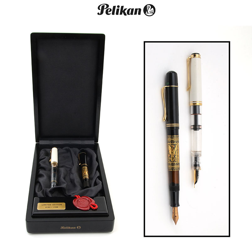 PELIKAN TOLEDO ORIGINALS 1931 FOUNTAIN PEN: Limited edition ''Toledo'' fountain pen, produces in 2003, this is number 198 of 1100. 18K gold nib, gold inlaid Damascene ring on black ebonite body, celluloid cap. 4 1/2'' long. Sold with original presentation box, paperwork and packing box. Outside box measures 3 1/4'' x 8 3/4'' x 5 1/4''. Also sold with this lot is a additional Pelikan pen with clear body, white cap, gold plated nib.