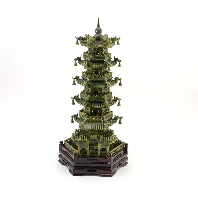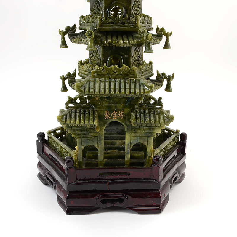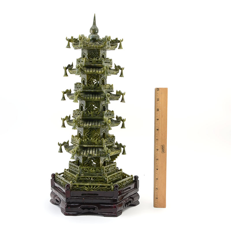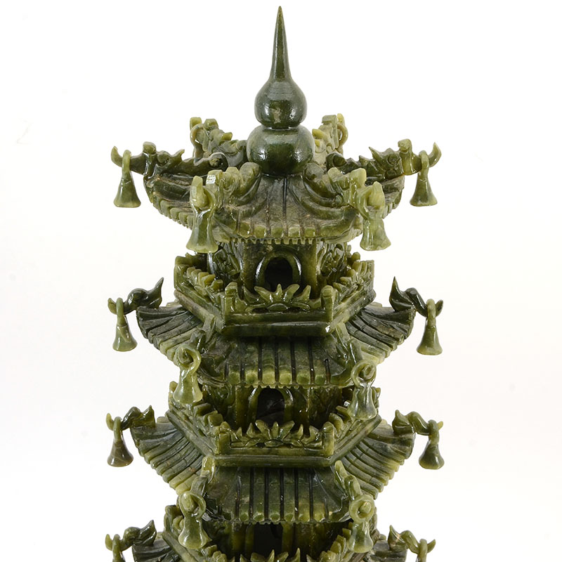 CARVED SPINACH JADE 5 STORY PAGODA: Chinese carved spinach jade or similar stone 5 level pagoda with entrance arch and hanging ''bells'', affixed to wood base, overall measures 19 1/2'' h. x 9'' dia.