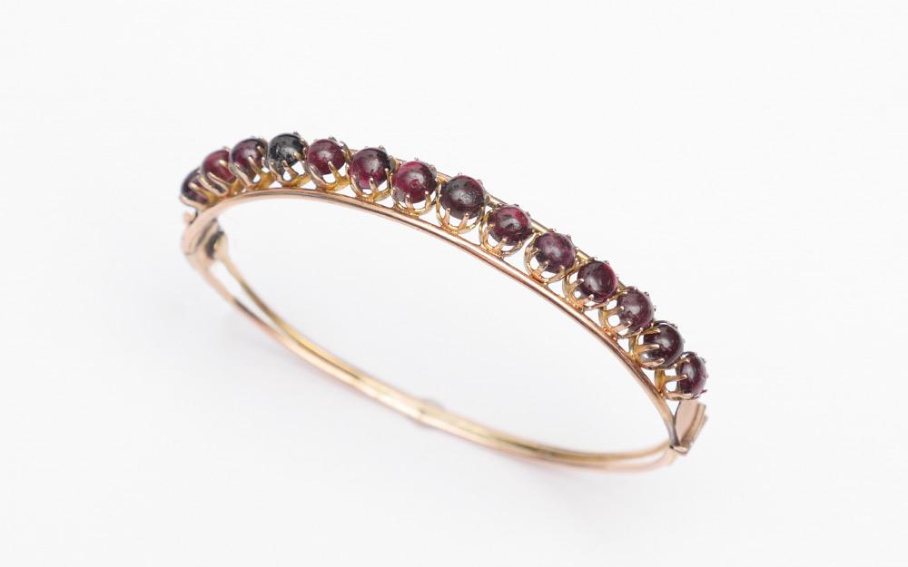 14K BANGLE WITH CABOCHON GARNETS: 14 cabochon garnets are prong set in-line on this rose gold bangle that measures 6.5''. 9.50 Ct approx. Total weight is 10.2 grams.