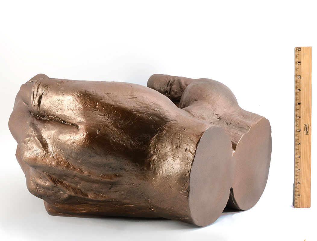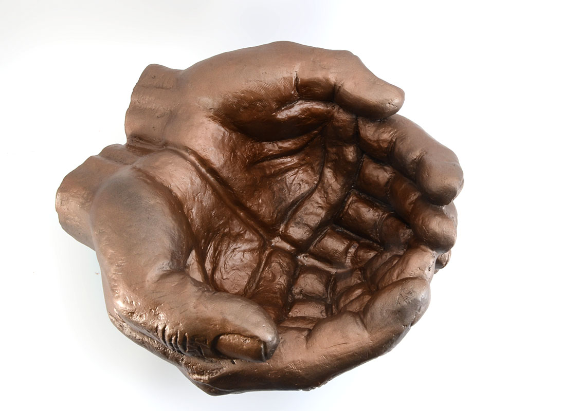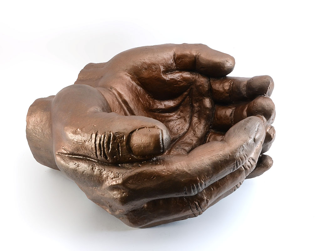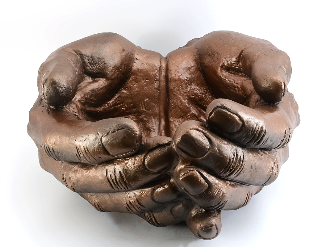 LARGE PAINTED BRONZE SCULPTURE OF CUPPED HANDS: 10'' H x 20'' D x 17'' W, no visible signature.