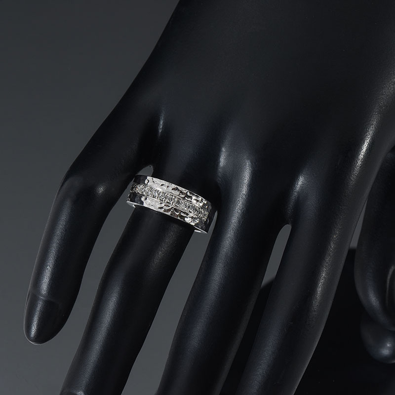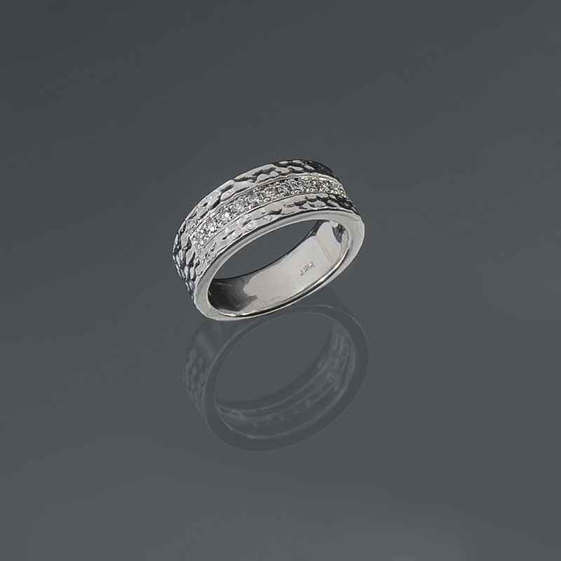 HAMMERED 14K BAND WITH CHANNEL SET DIAMONDS: 14K hammered white gold band contains 13 round brilliant cut diamonds. Weight: .25 Ct. Approx. Rated VS in clarity and G-H in color. The diamonds are prong set. Weight: 7.9 grams. Size: 6.5