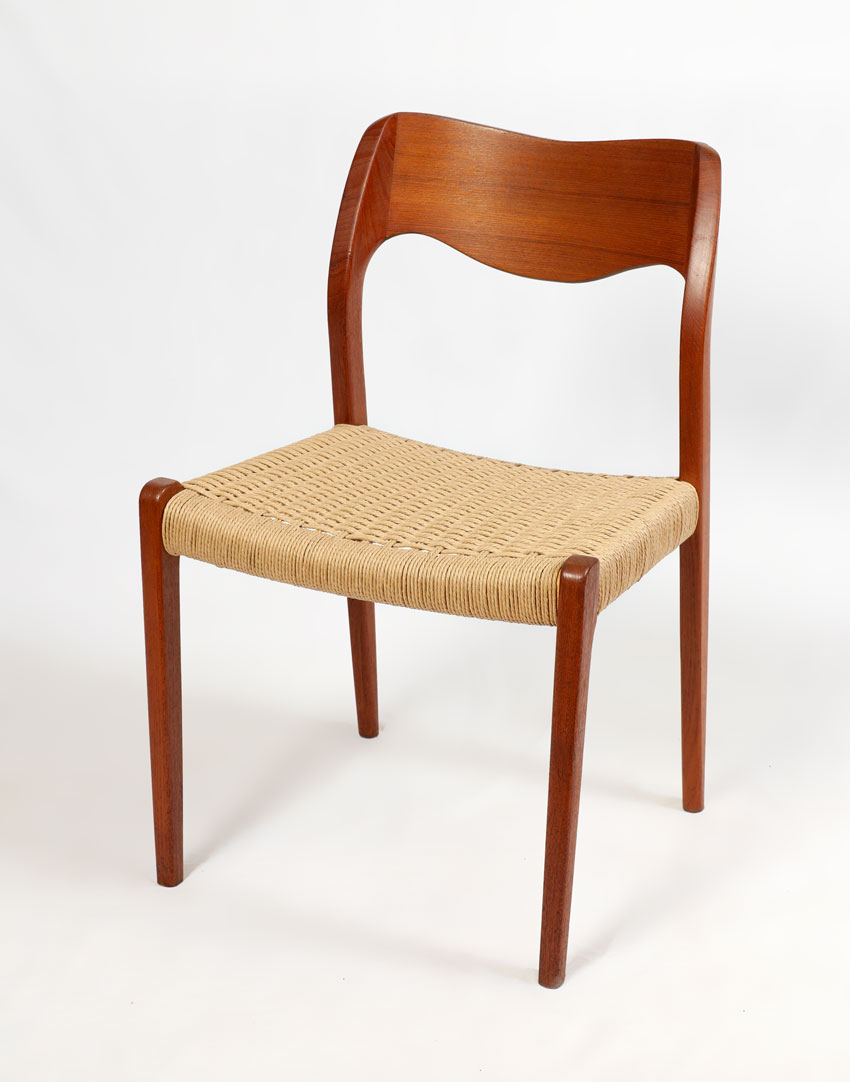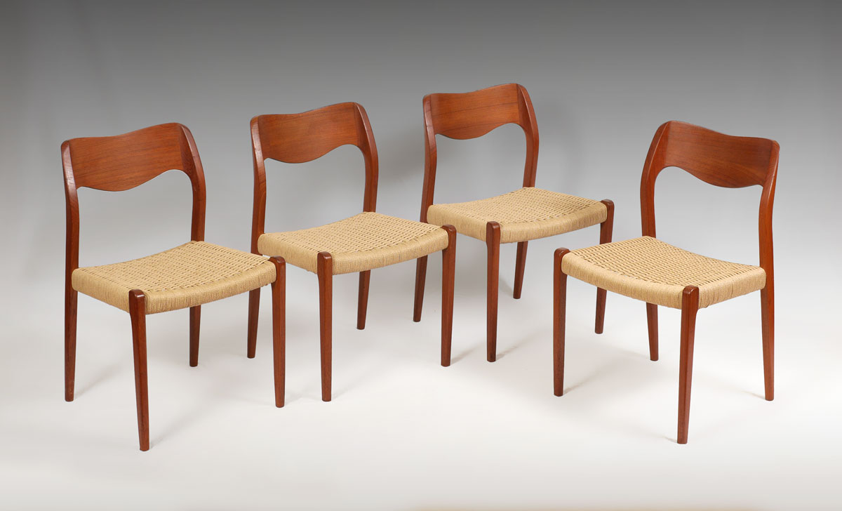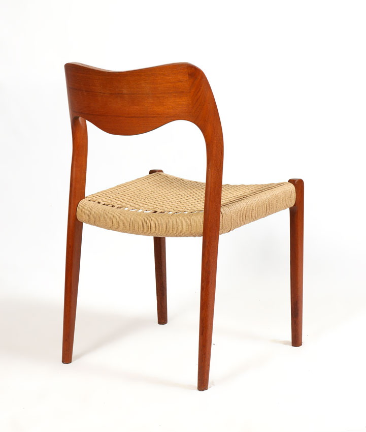 4 NIELS MOLLER MODEL 71 DANISH DINING CHAIRS: Teak frames with shaped back, tapered legs, woven seat. Designed by Niels Moller, made by J.L. Moller in Denmark. 31'' h. x 19 1/2'' x 19 1/2''.