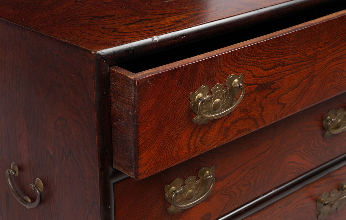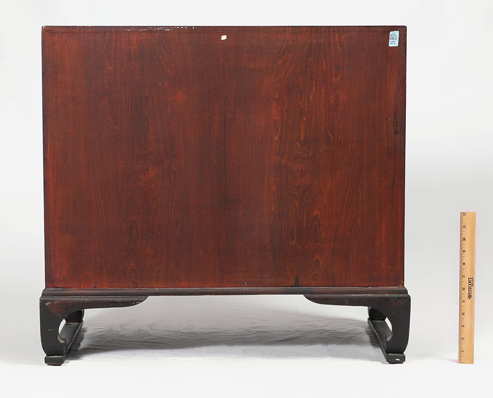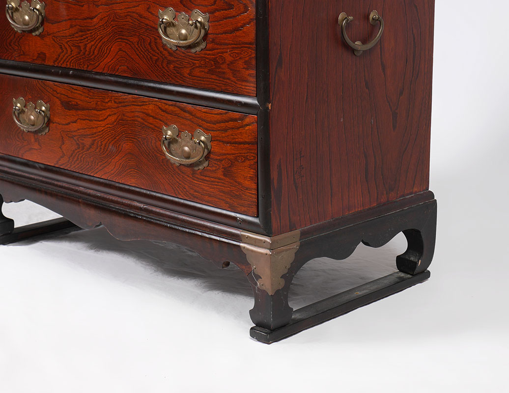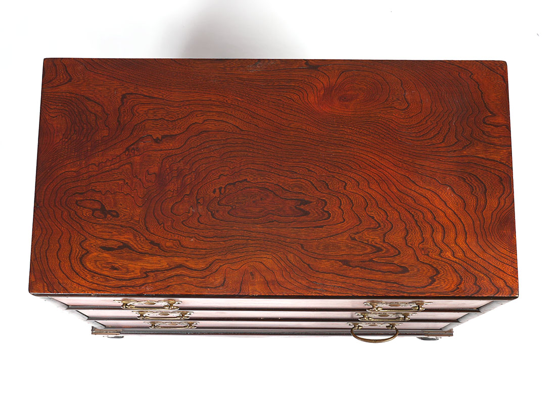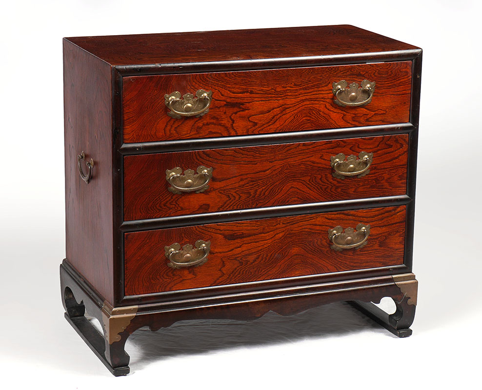 ROSEWOOD ORIENTAL CAMPAIGN CHEST: 3 drawer rosewood case, brass side handles and pulls, carved skirt, on 2 pedestal feet, measures 27'' h. x 28 1/2'' x 14 3/4''.