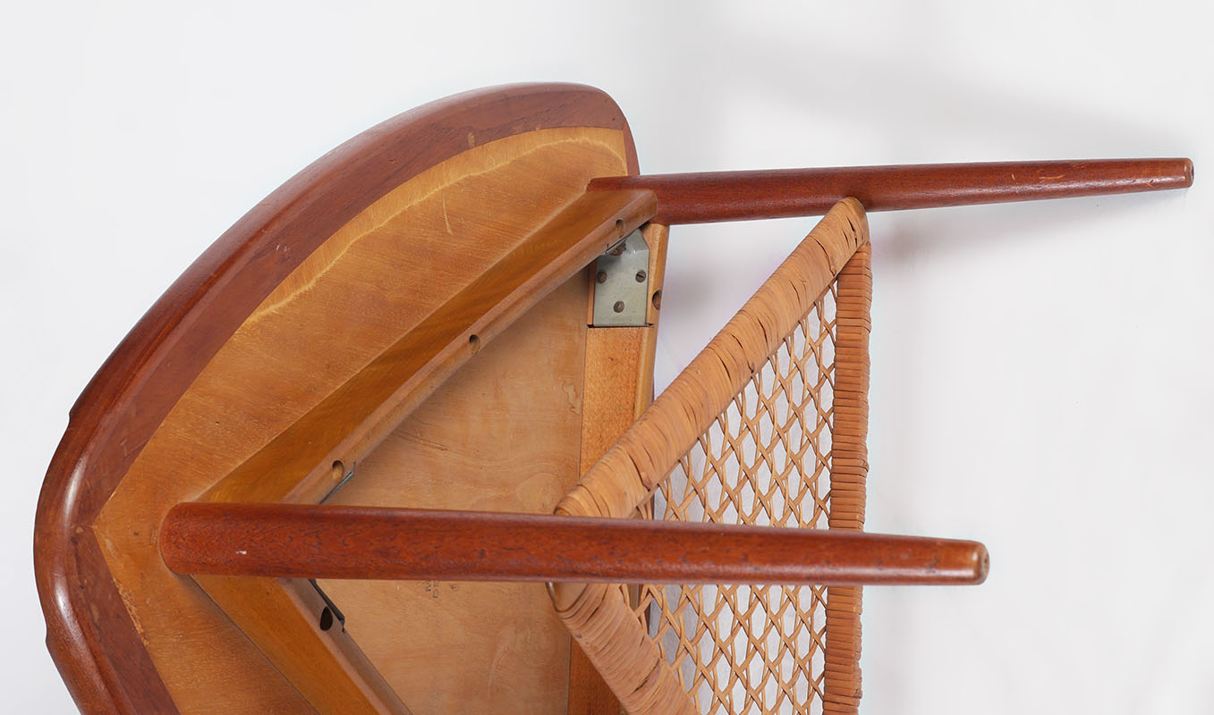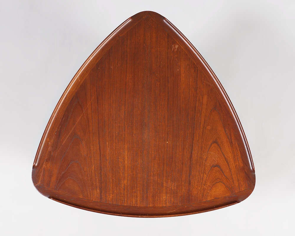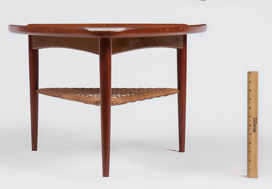 POUL JENSEN FOR SELIG TRIANGULAR TEAK TABLE: Triangular teak occasional table with caned lower open shelf, designed by Poul Jensen for Selig, marked Made in Denmark. Measures 17 1/4'' h. x 25 3/4''.
