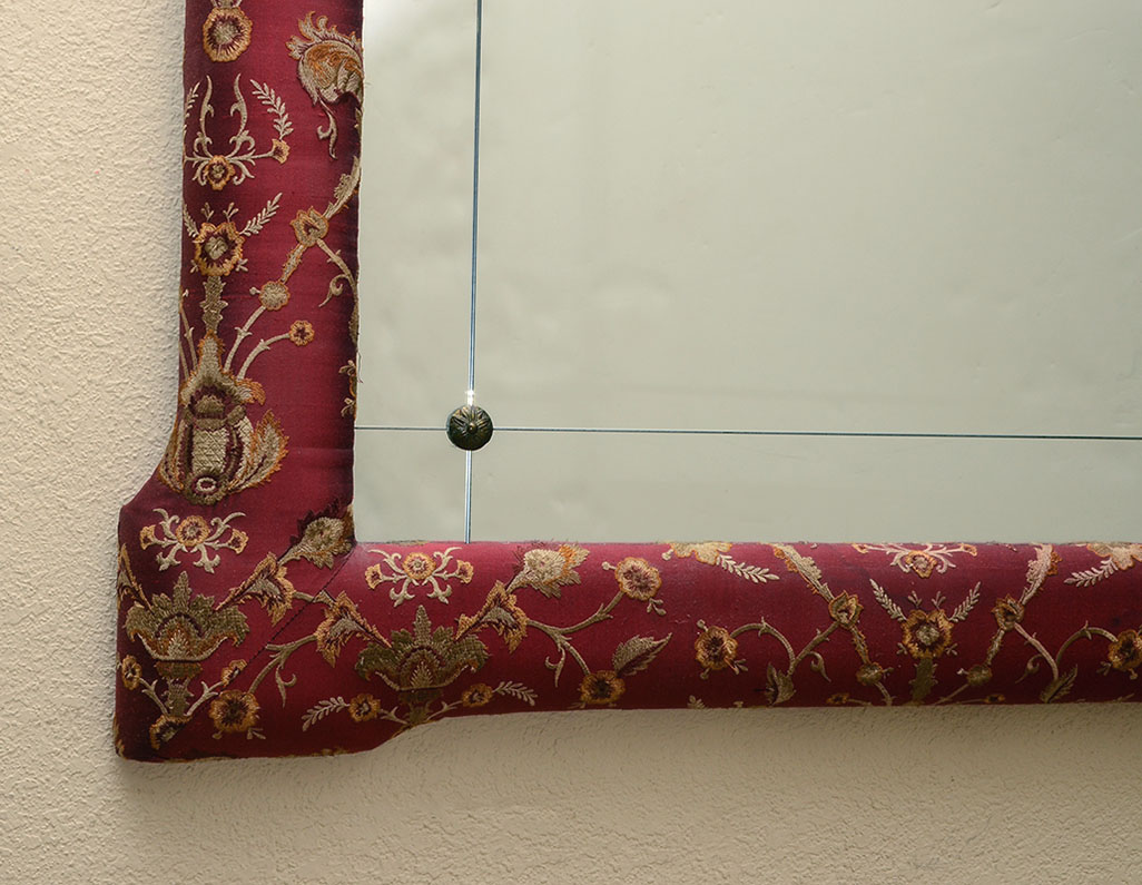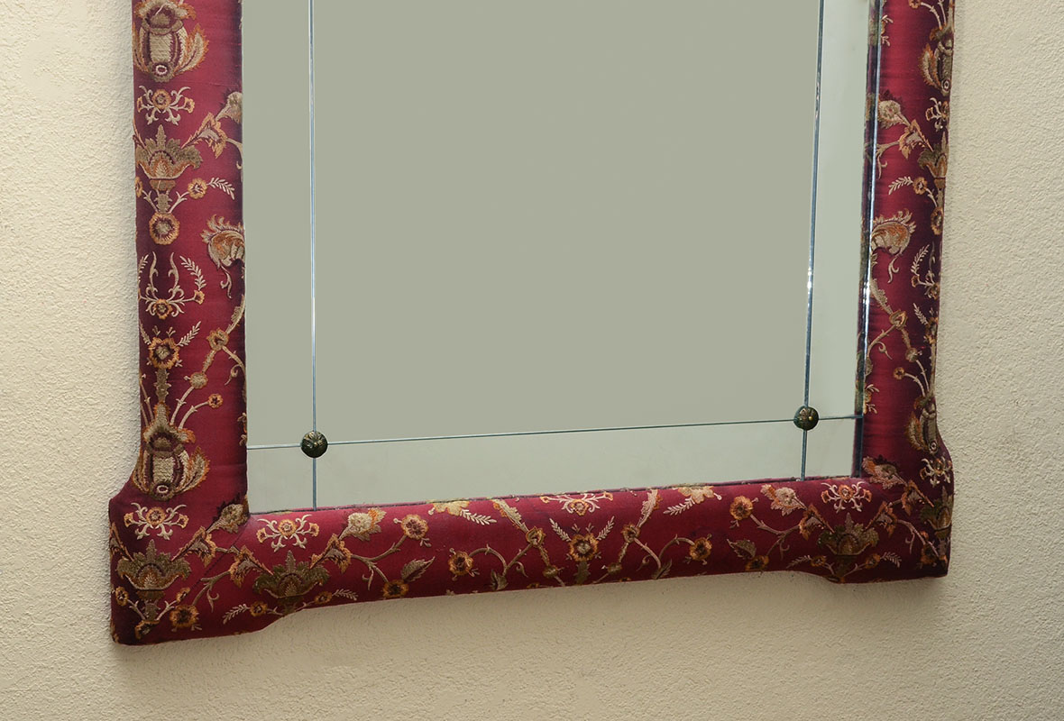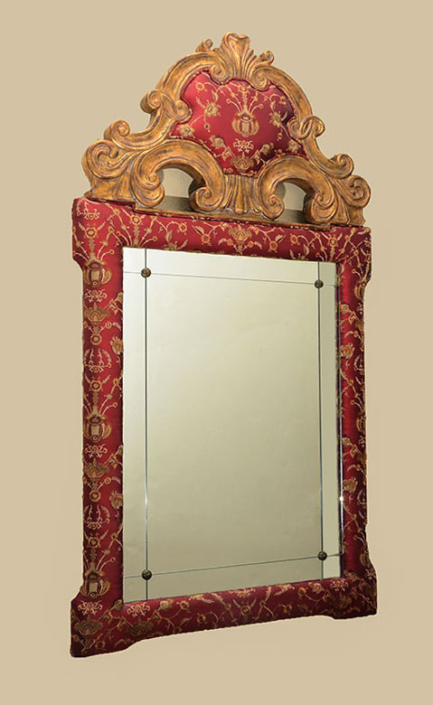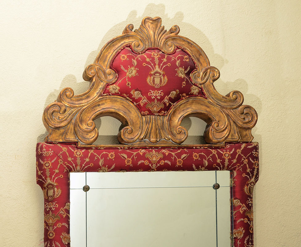 LARGE LABARGE GILTWOOD UPHOLSTERED WALL MIRROR: Carved giltwood frame with foliate scroll crest, red floral motif upholstered medallion and trim. Sectioned glass mirror, overall 66 1/4'' h. x 37'' x 3''.