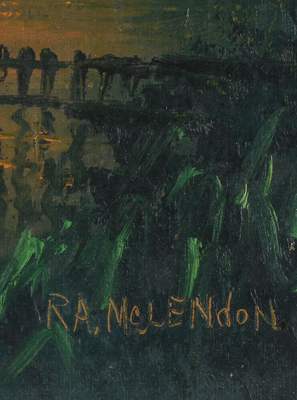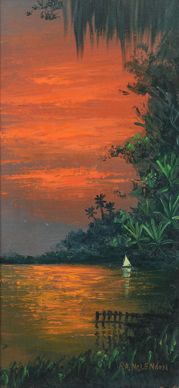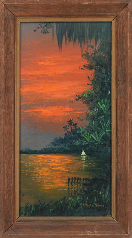 MCLENDON, Roy, (American, 20th Century): Florida Highwaymen fire sky Indian River Lagoon scene with dock and sailboat, Oil/Upson, signed lower right, 24'' x 12'', framed 27 1/2'' x 15 1/2''.