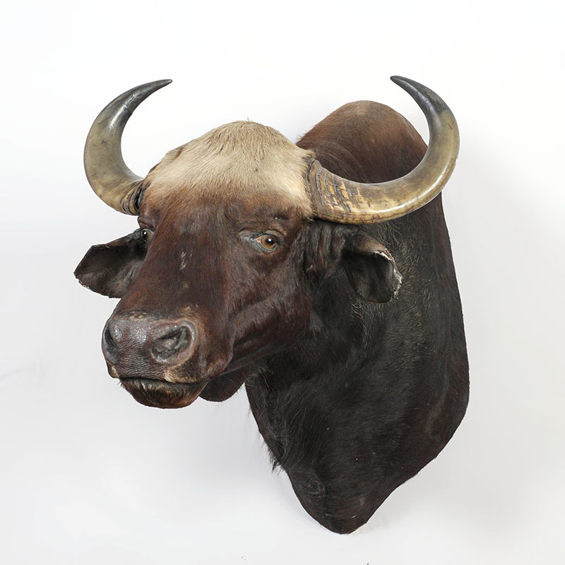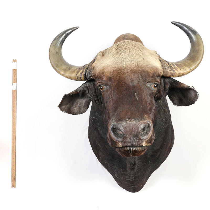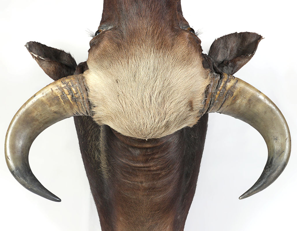 LARGE WATER BUFFALO TAXIDERMY MOUNT: Shoulder mount of a large Water Buffalo, overall measures 47'' h. x 33 1/2'' x 47'' deep.