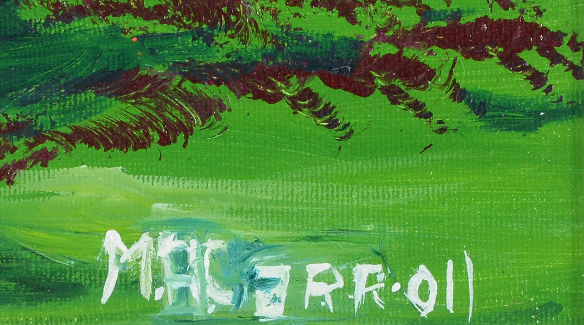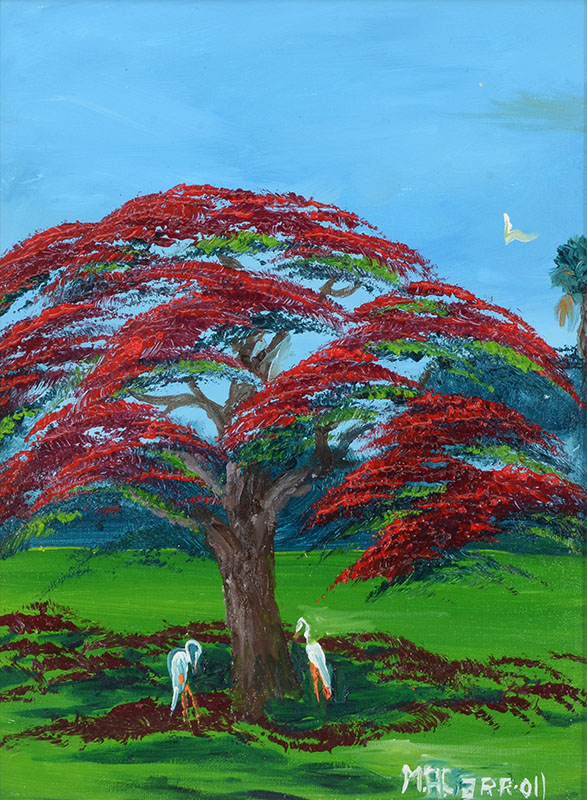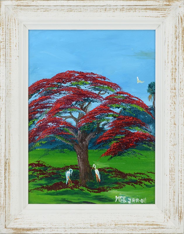 CARROLL, Mary Ann, (American, 20th Century): Florida Highwaymen Royal Poinciana scene with cranes, Oil/Board, signed lower right, 12'' x 16'', framed 19 1/2'' x 15 1/2''.