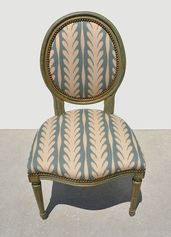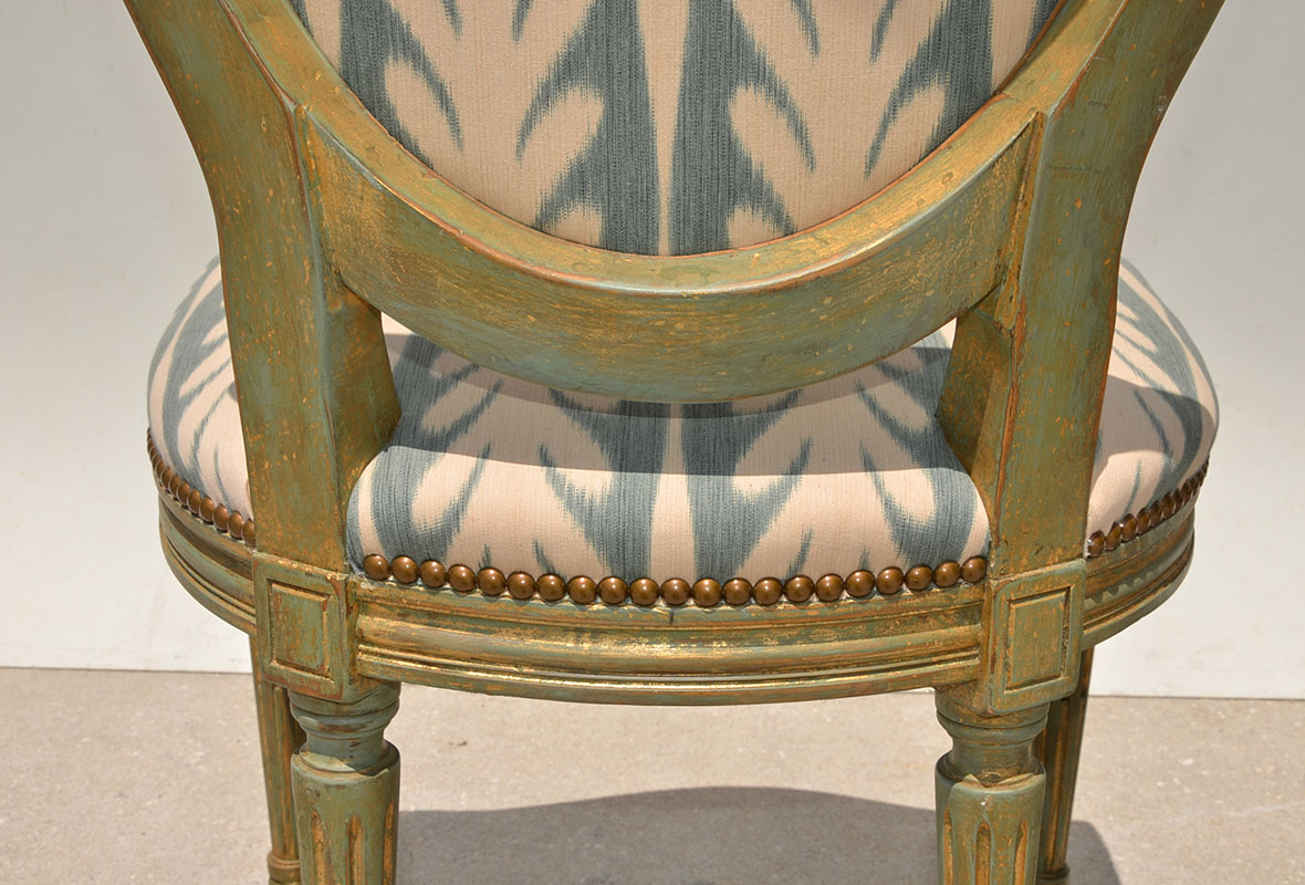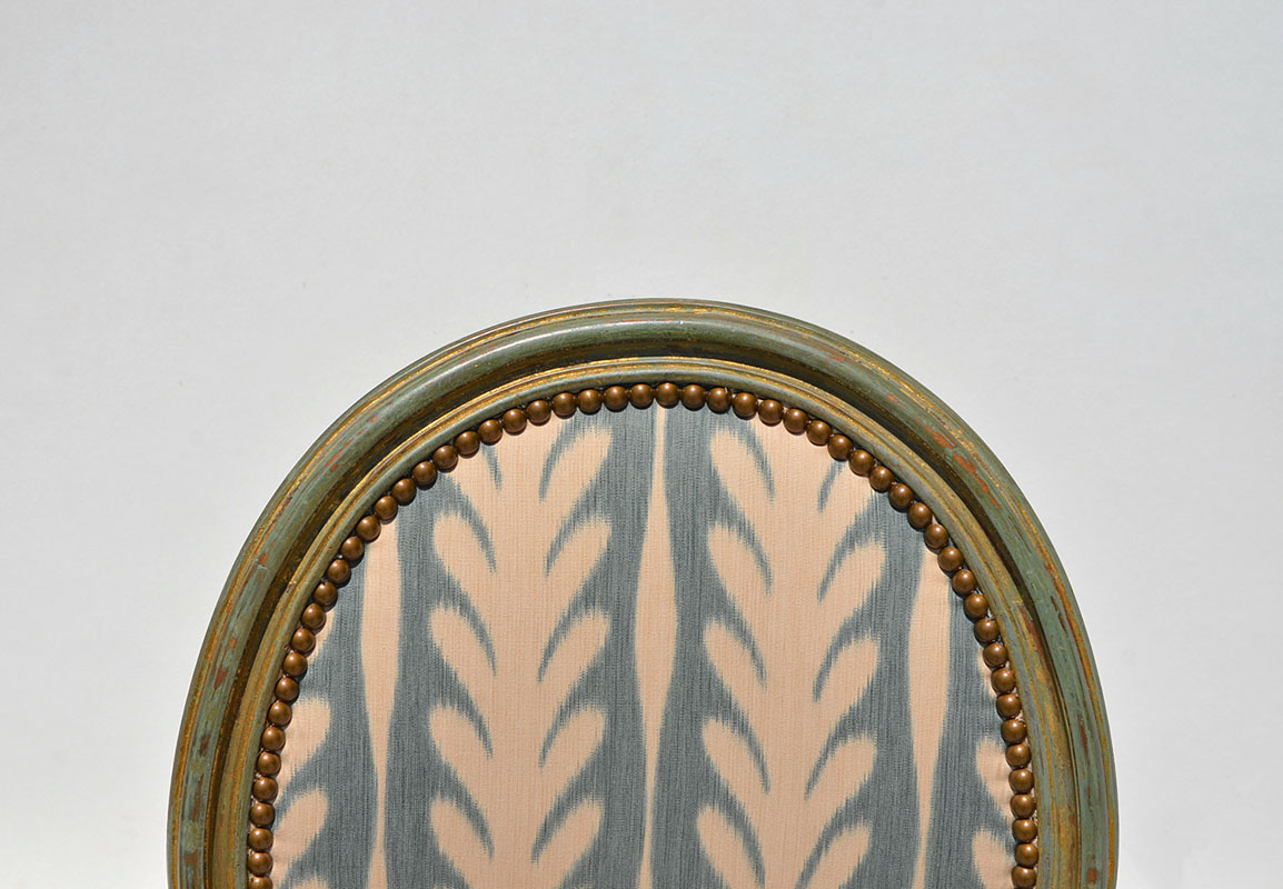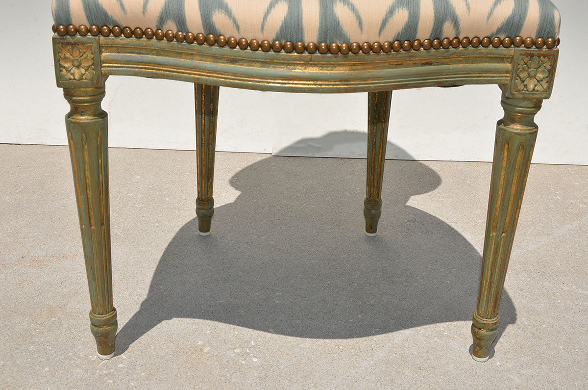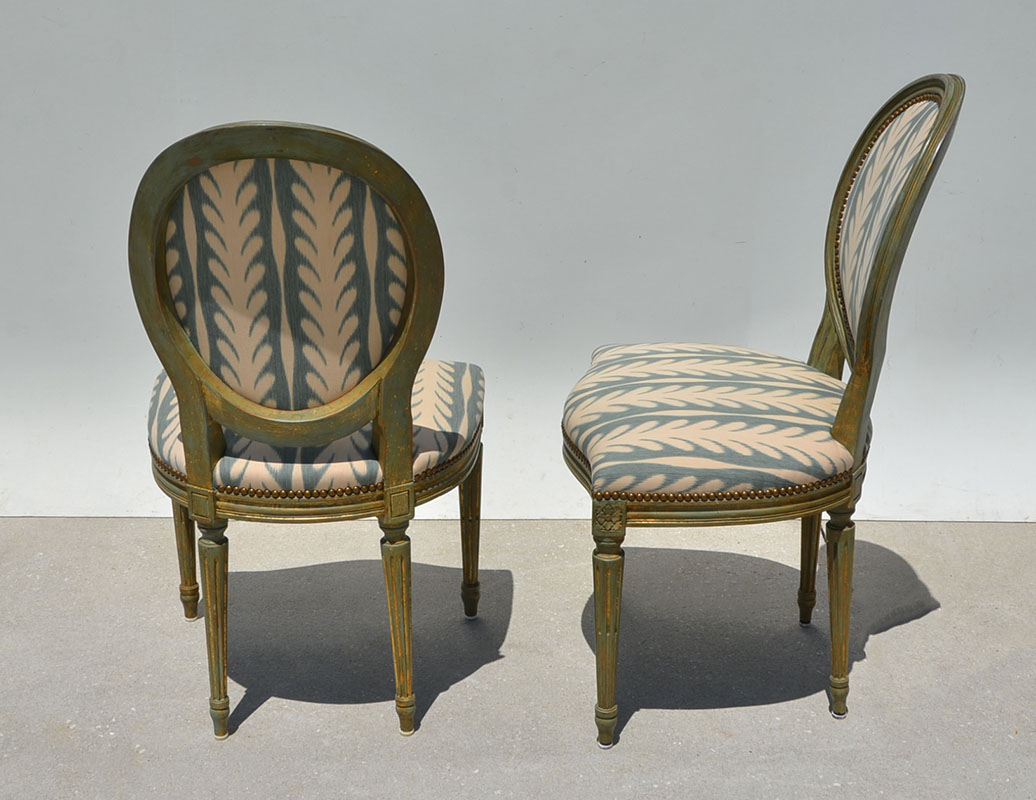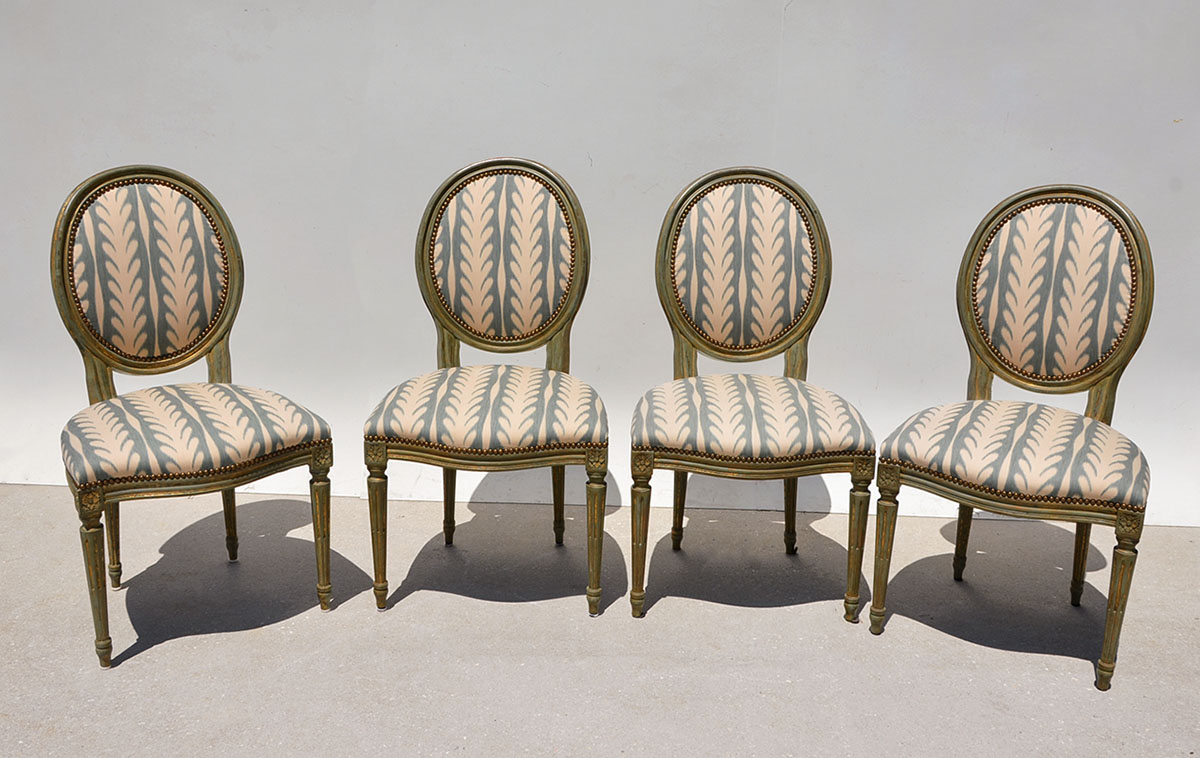 4 LOUIS XVI STYLE CHAIRS: Painted frames with antique appearance, shaped medallion backs, shaped skirt with carved floral medallions at joints, fluted legs. Tacked striped floral pattern upholstery. Measures 74 1/4'' h. x 26 1/2'' x 27''.