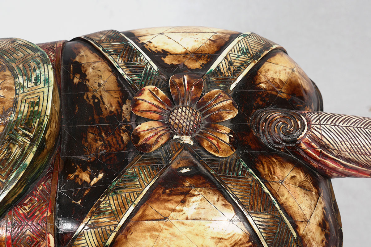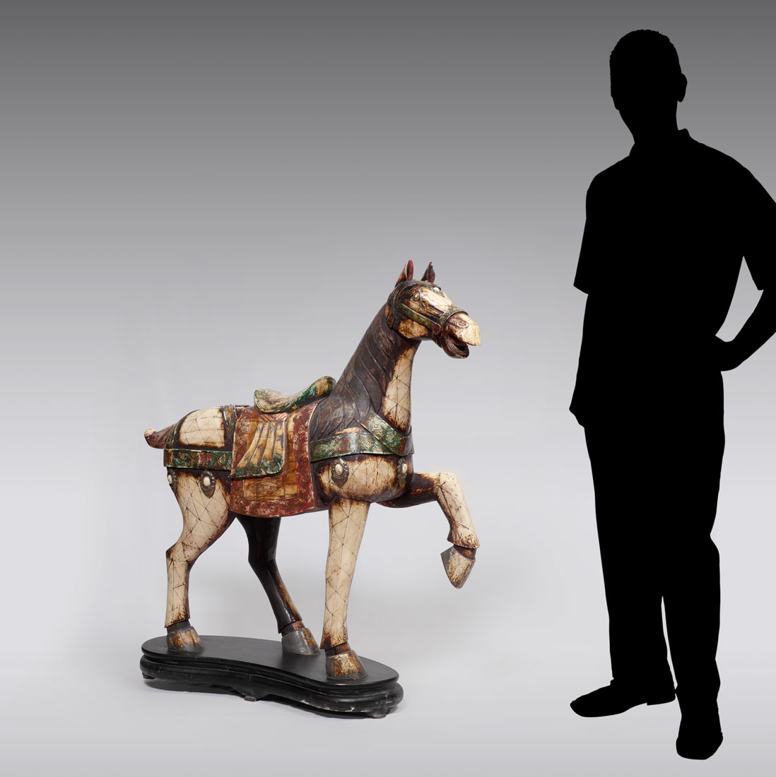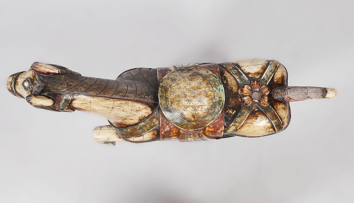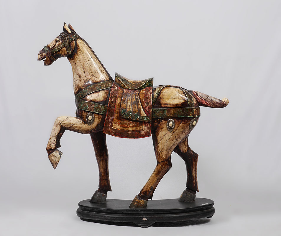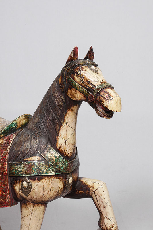 LARGE BONE TILE CLAD FIGURAL HORSE: Figure of a horse clad in polychrome carved bone panels, affixed to wood base. Overall measures 46 1/2'' h. x 45 1/2'' x 14 1/2''.