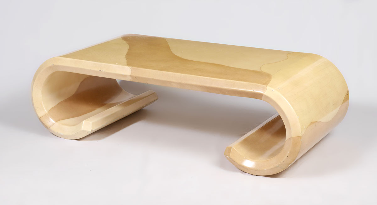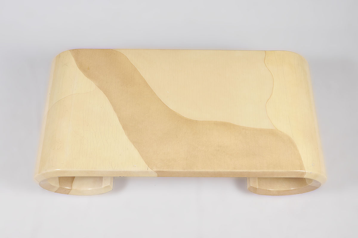 ATTRIB. KARL SPRINGER SCROLL COFFEE TABLE: Unmarked, painted and lacquered body with scroll legs, overall measures 16 1/2'' h. x 26 1/4'' x 54 1/2''.