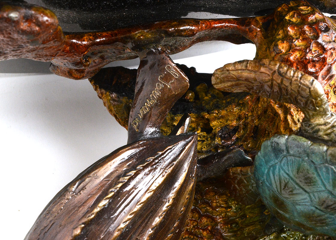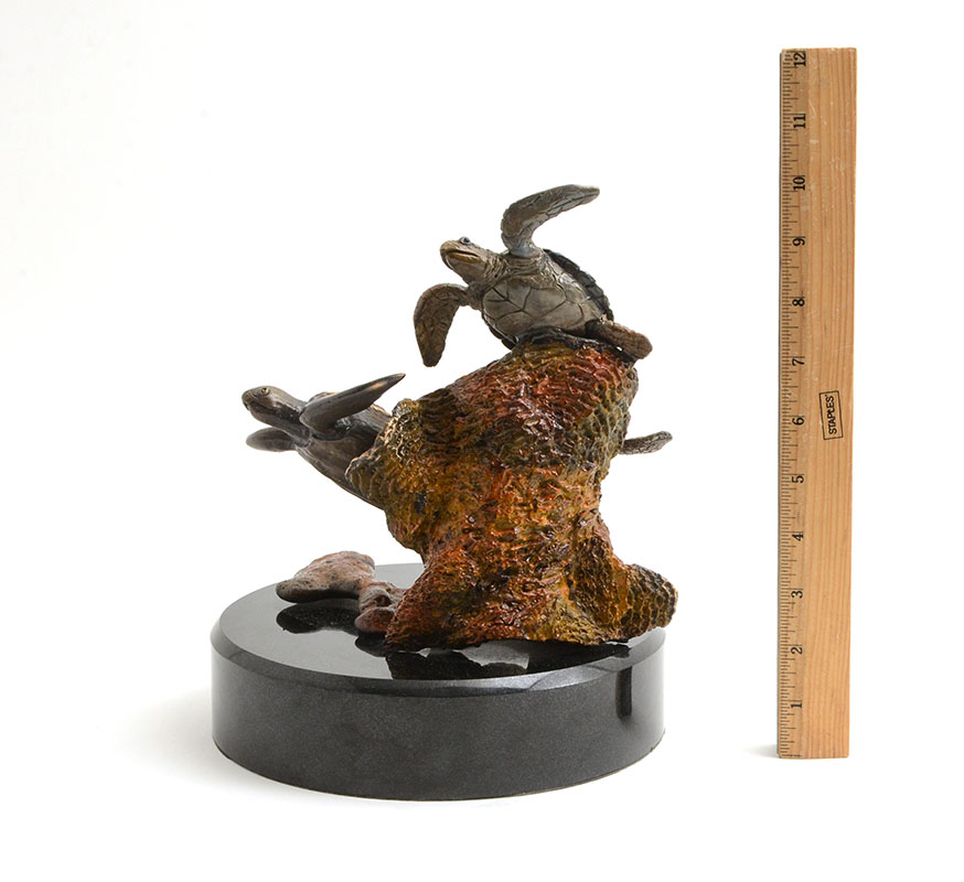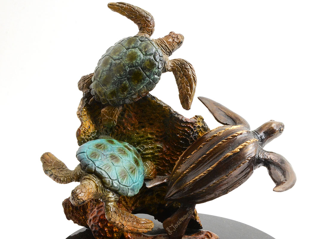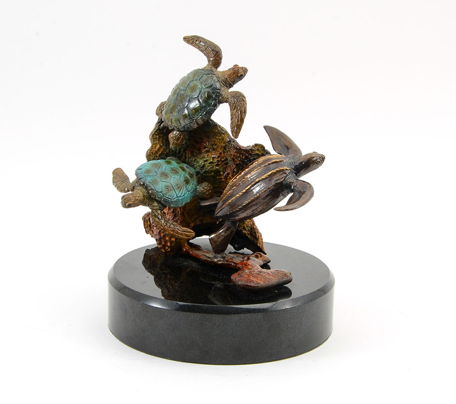 TOWNSEND, John, (American, 21st Century): Cold painted bronze figural group of 3 sea turtles at a coral reef on black granite plinth, signed on back flipper of one turtle, overall 10'' h. x 8 3/4'' dia.