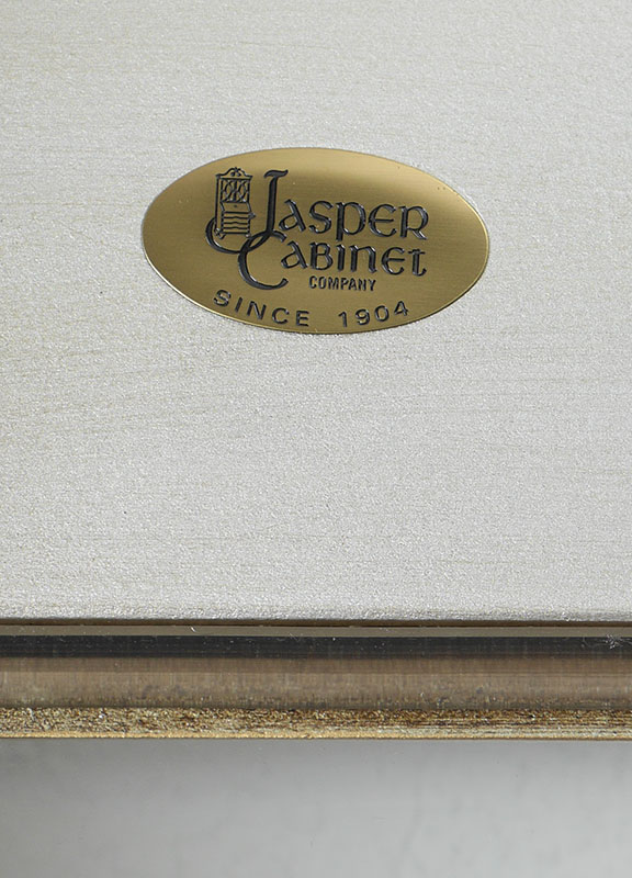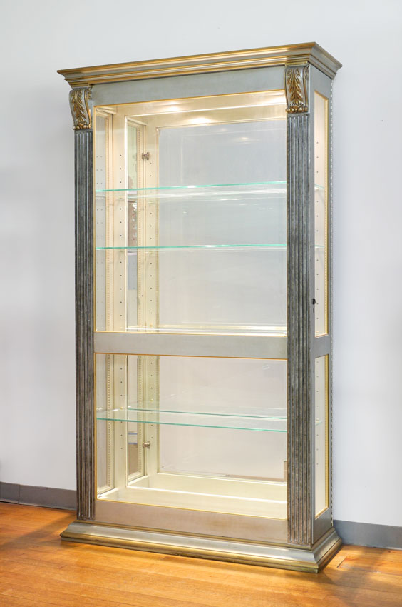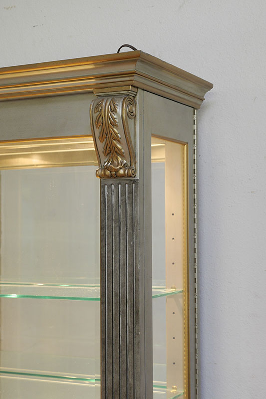 JASPER FURNITURE CHINA / DISPLAY CABINET: Carved and painted cabinet, acanthus leaf scroll over fluted stiles, glass front, side glass doors. Illuminated interior, glass shelves, overall 83 1/2'' h. x 47'' x 16 1/2''.