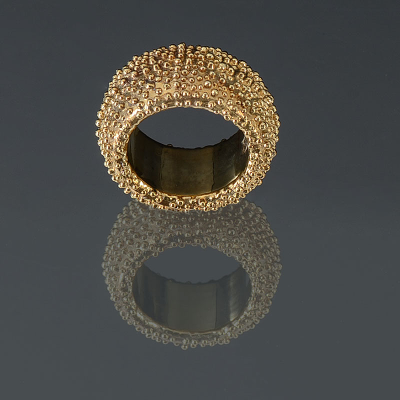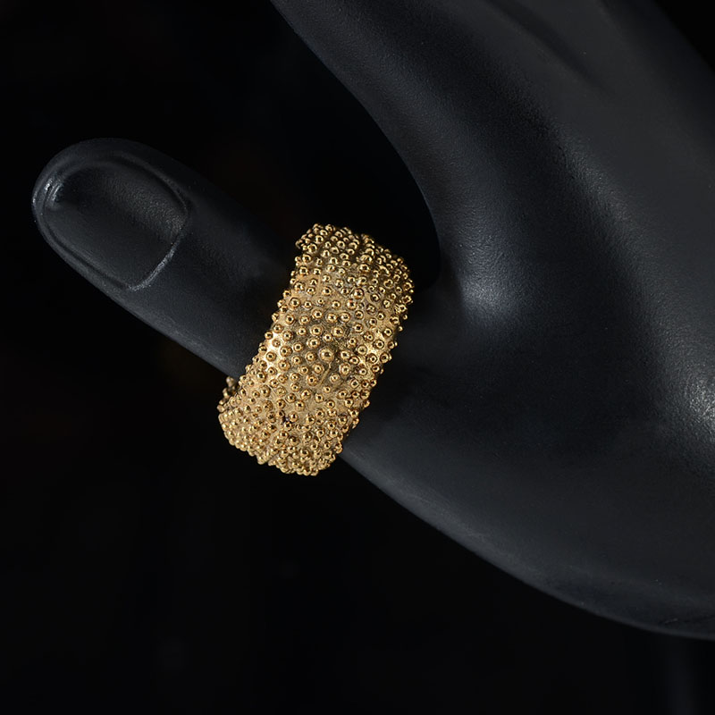 ITALIAN 14K HOLLOW WIDE BAND: 14K yellow gold band. Hollow with Etruscan styling. Width: 14.0 mm Weight: 3.8 grams. Size: 7